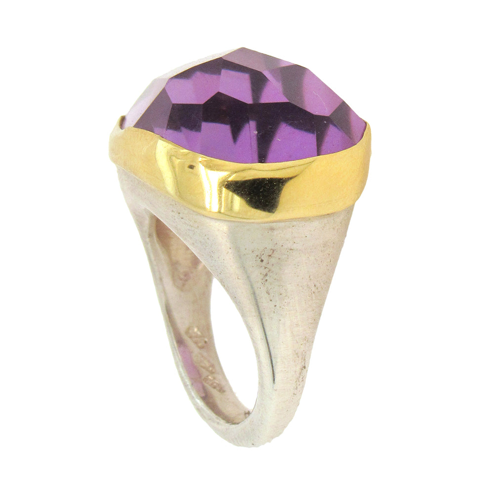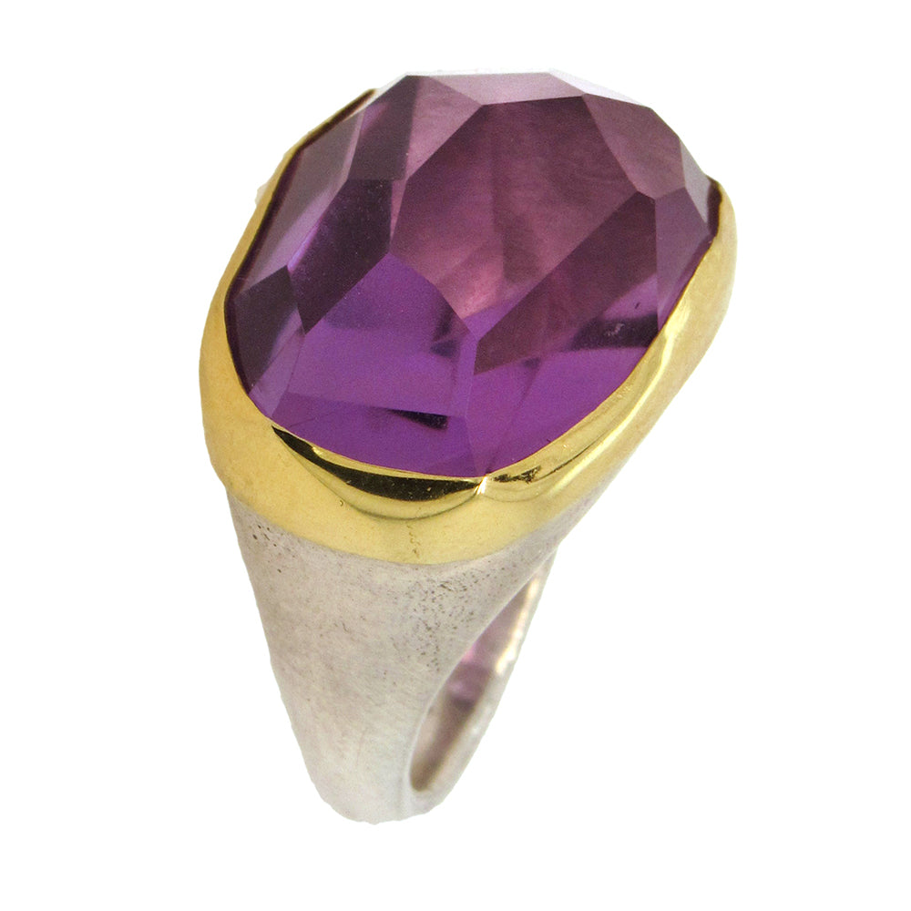 Fit for a Royal, a 31 carat rose-cut amethyst is set in 18K gold bezel, sterling silver mounting, from Margoni Studio. The ring measures 1" x 3/4" x 3/8".