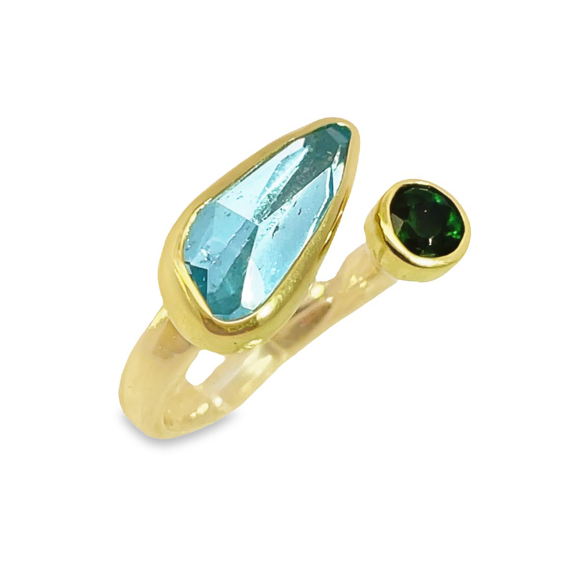 Margoni Studio asymmetrical ring is set with a rose-cut aquamarine accented with a deep green round tourmalline, set in 18K gold with a sterling shank. The ring measures 3/4" x 1/2" and is size 7.