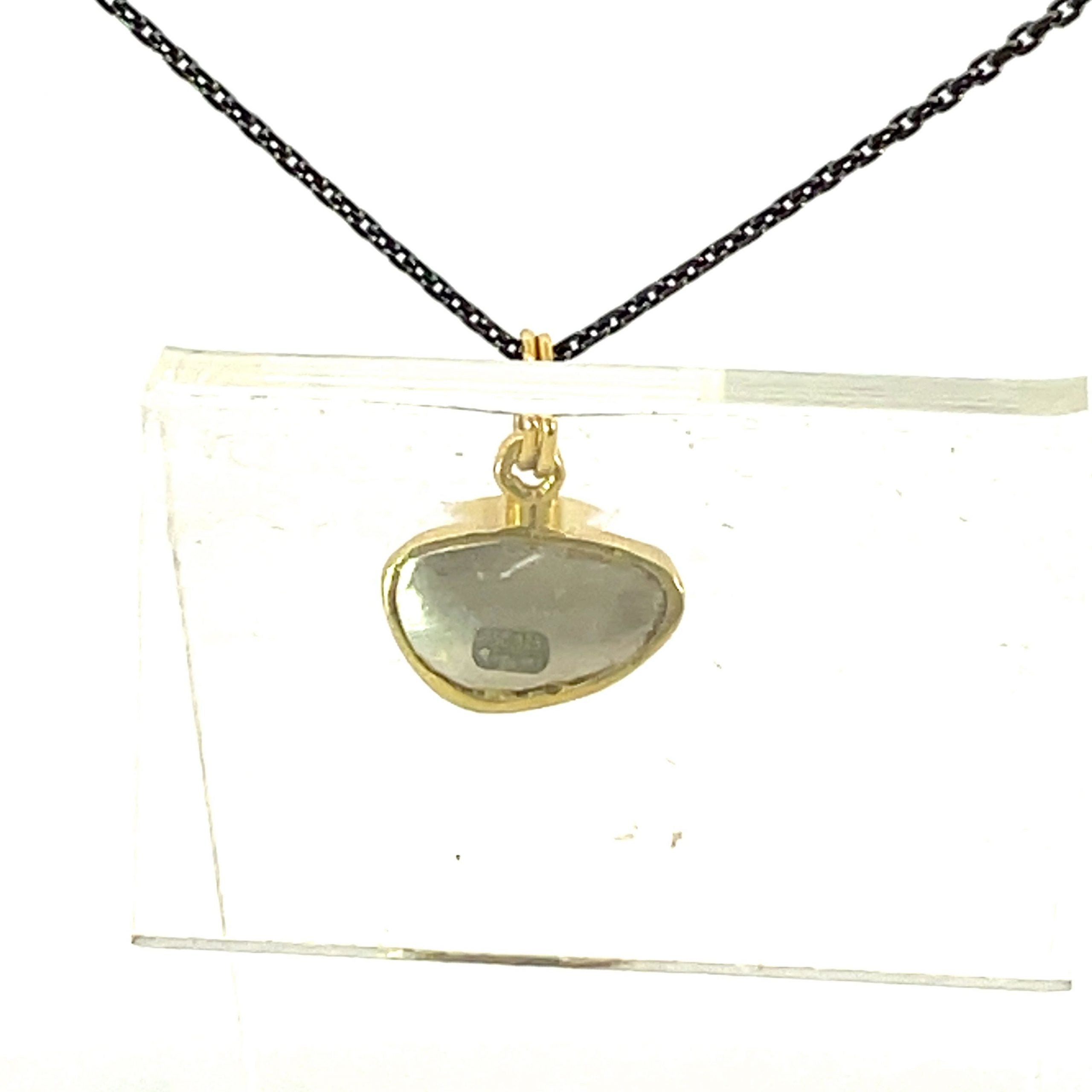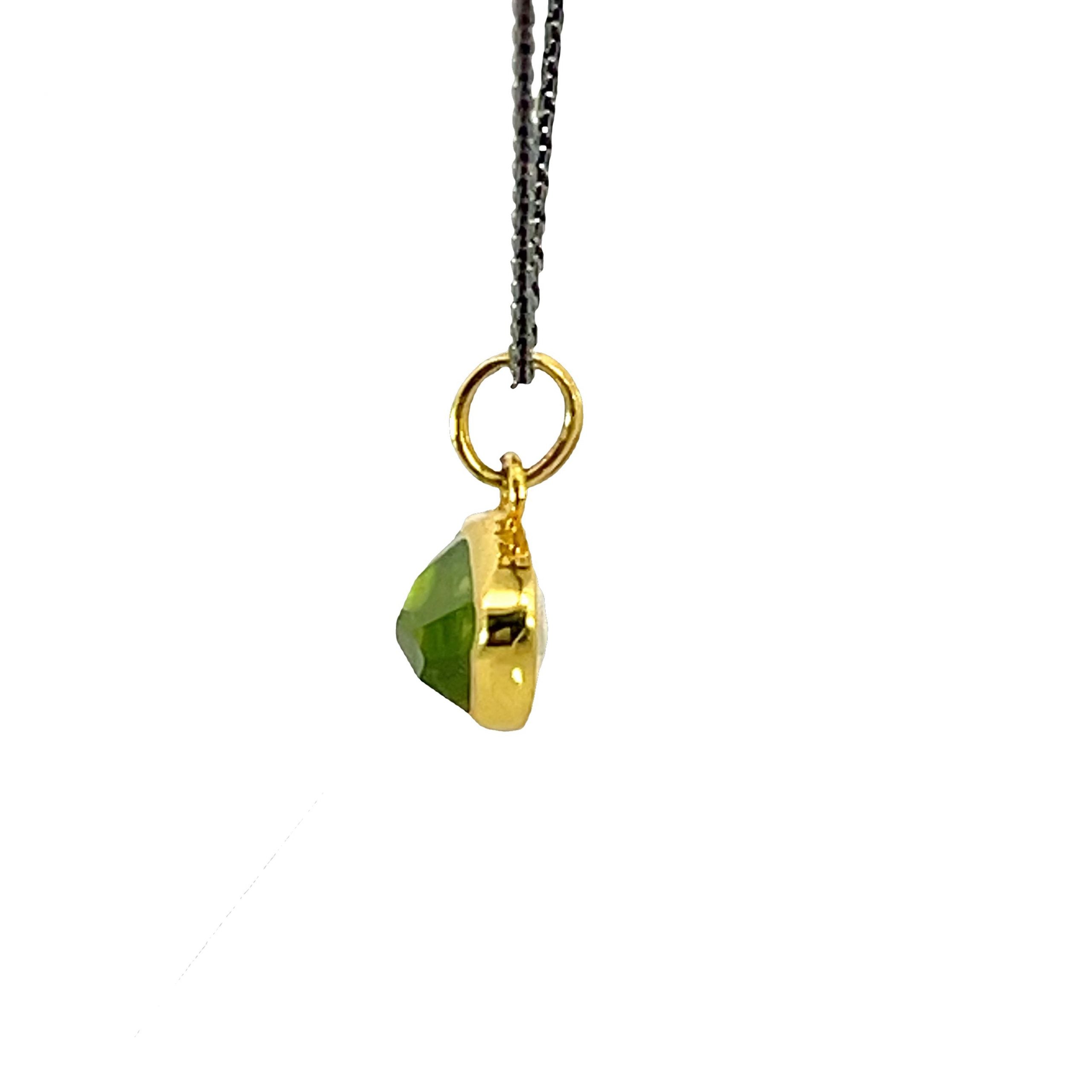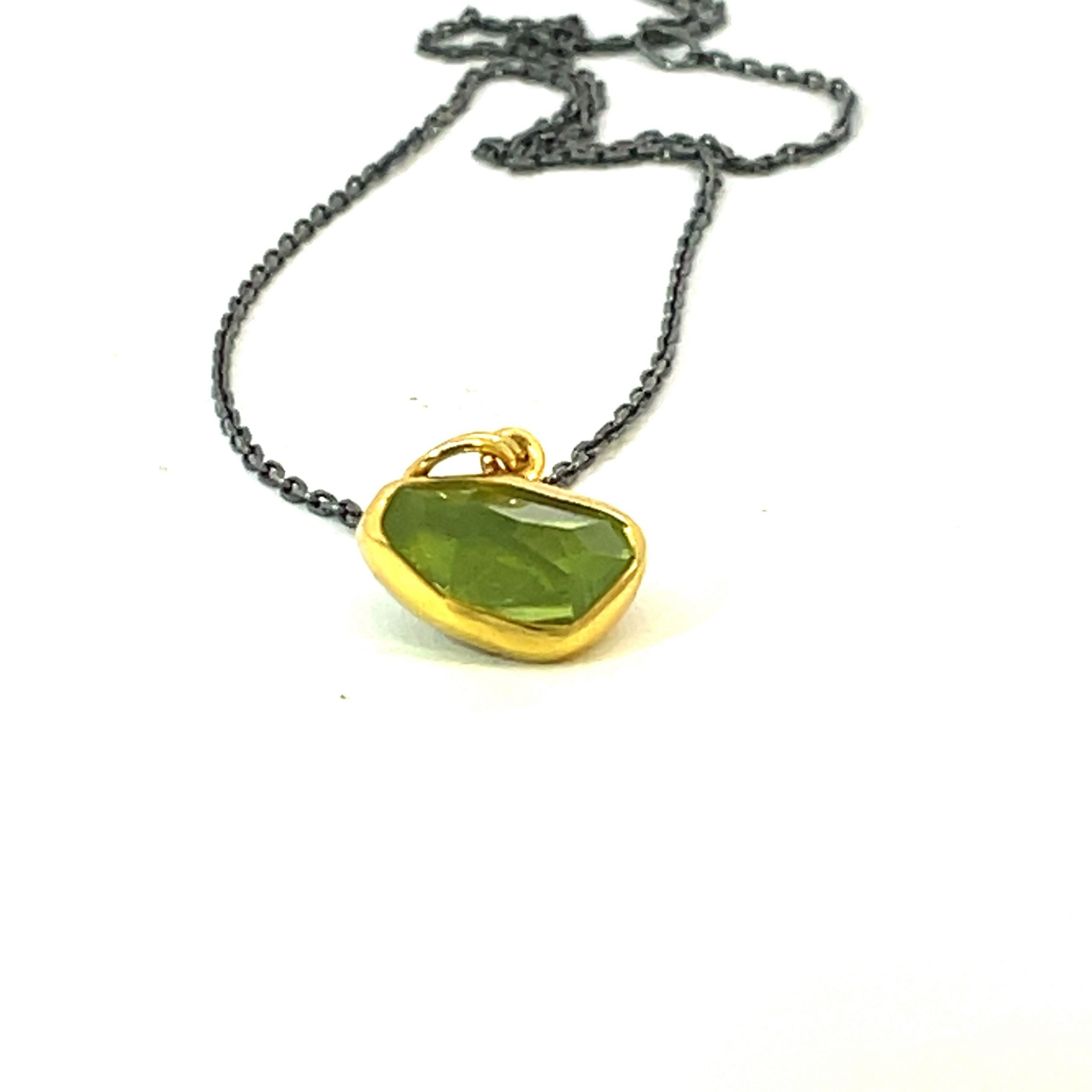 Margoni Studio sets a 3.5 carat rose-cut peridot in 18K gold with sterling silver for this pendant, 1/2" x 1/4", on an adjustable 16"-18" oxidized sterling chain.