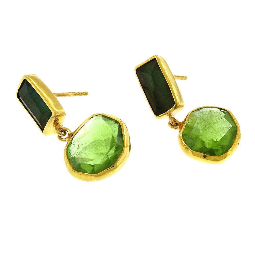 Studio Margoni combines spring green rose-cut round peridots with rectangular rose-cut green tourmalines, 16.50 carats of gems total weight, for these easy-to-wear earring drops in 18K yellow gold. Earrings measure 1/2" at the widest x 1" long.