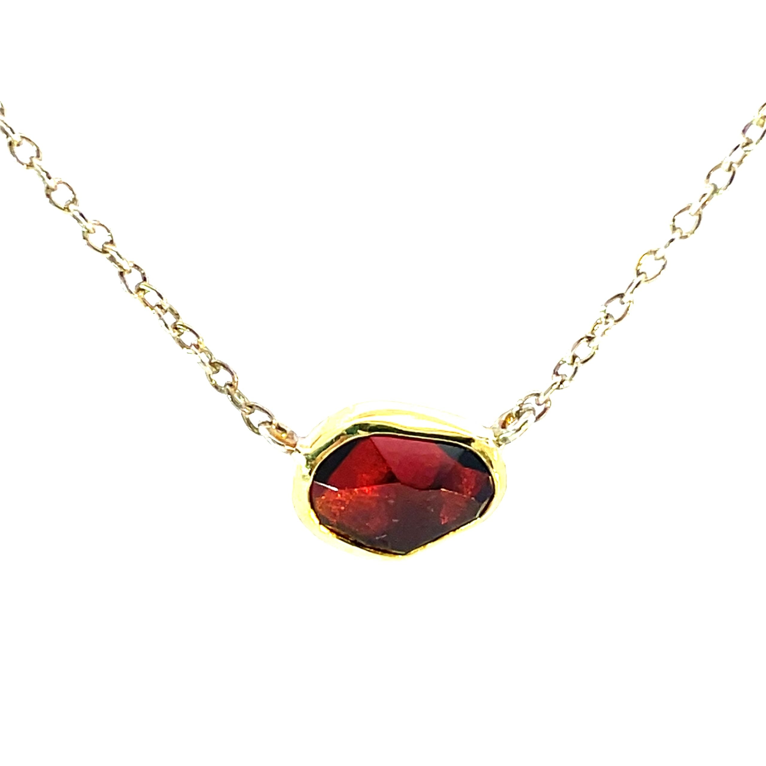 Mary Margoni designs these very wearable jewels from her studio in Greece, this necklace with a rose-cut 3.50 carat garnet set in 18K gold with sterling silver back. The pendant measures 3/8" x 3/8" on a sterling silver 18" fine cable chain.
