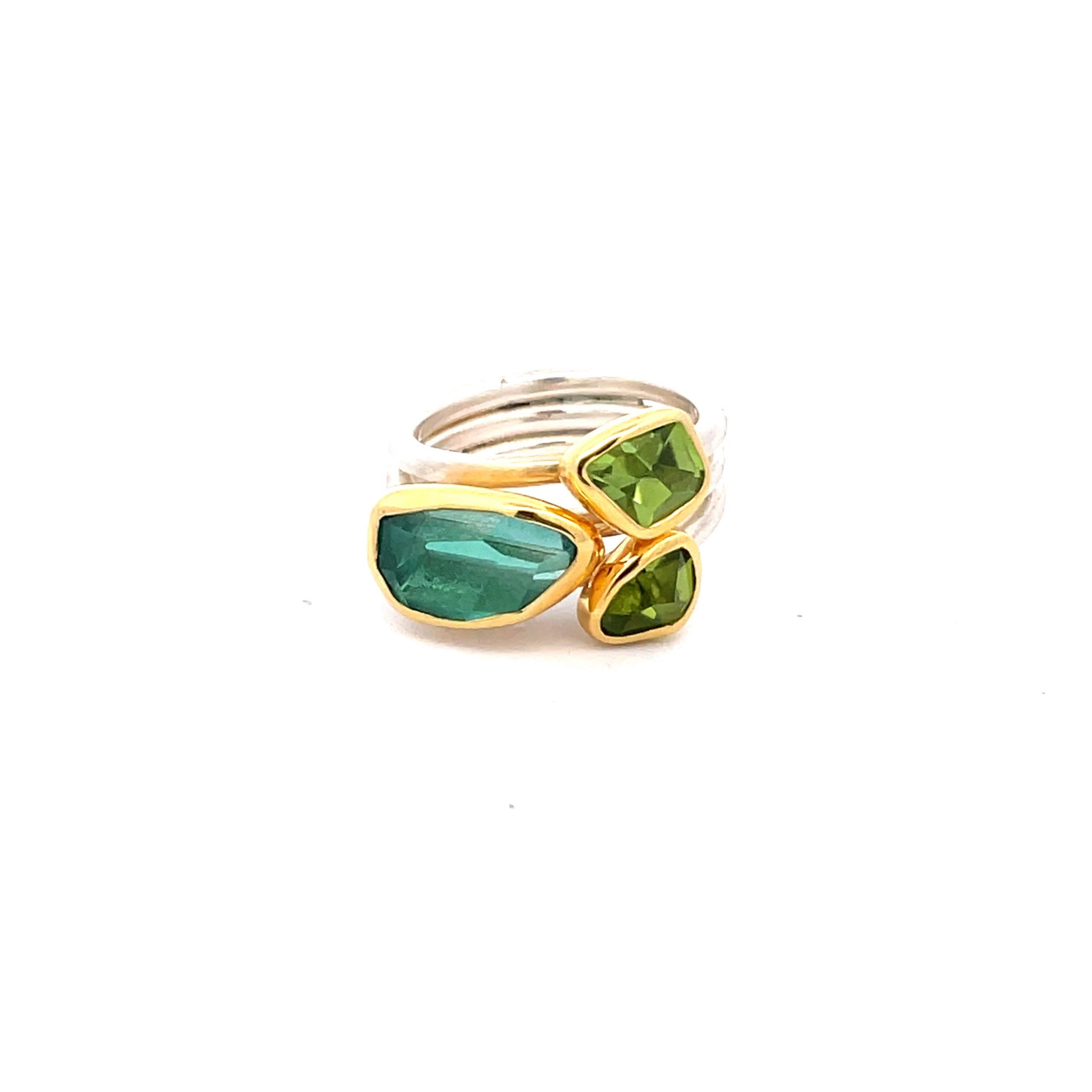 We love Margoni's rose-cut gemstones, clustered together with bright color and sparkle: three tourmalines in greens and blue-green, are set in 18K yellow gold atop a triple-shank sterling silver ring. The ring measures 3/4" x 1/2" and is size 7.