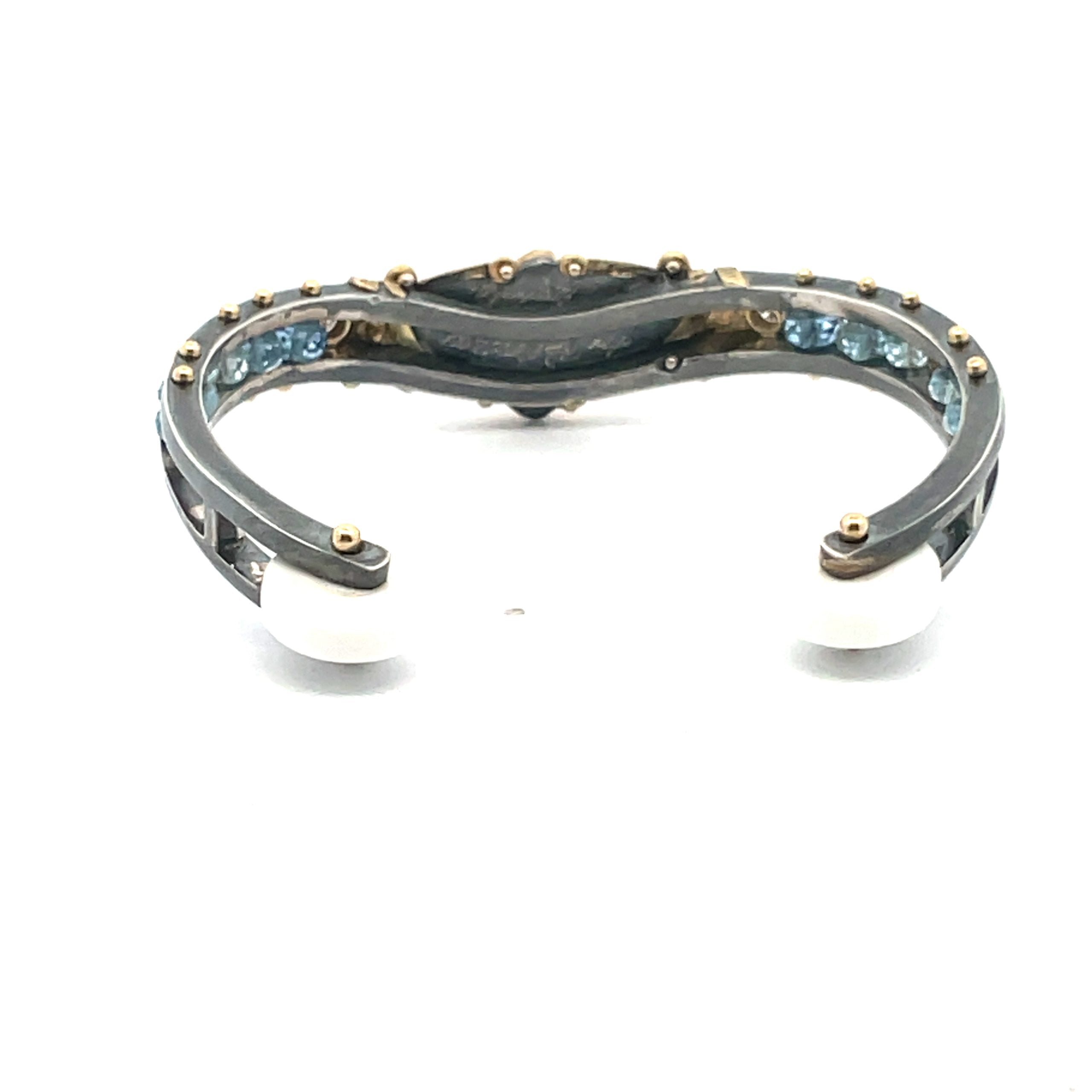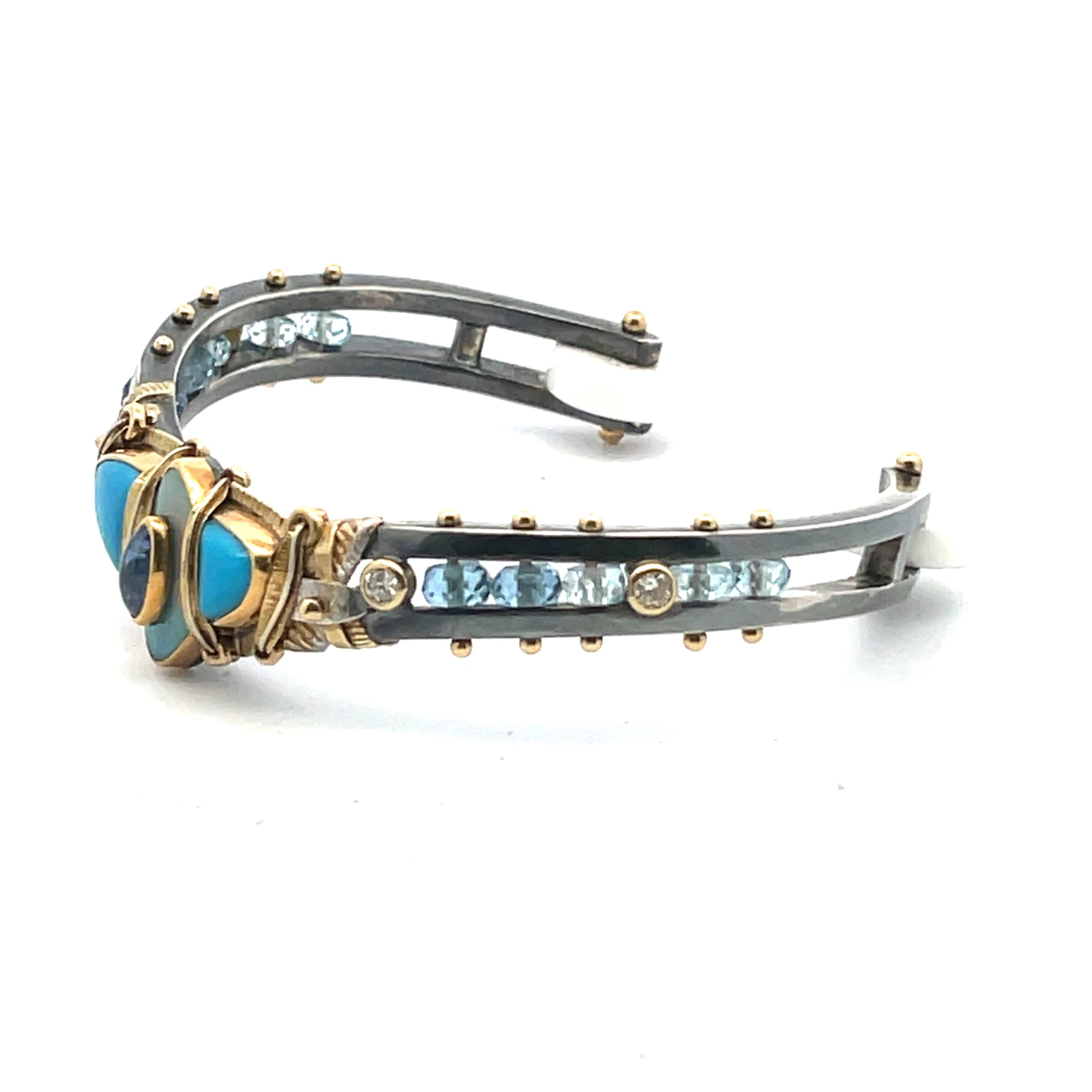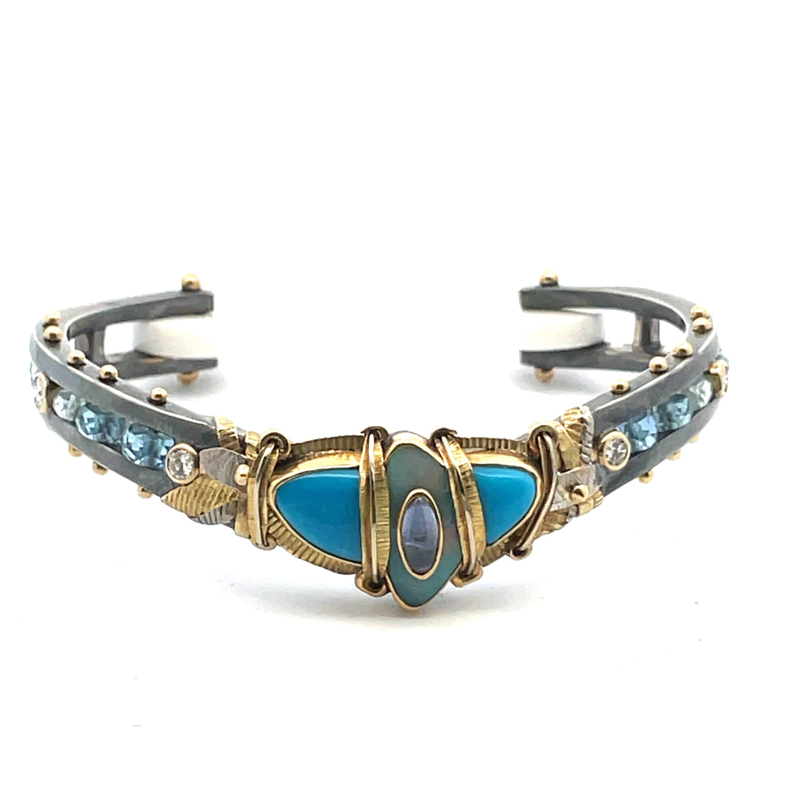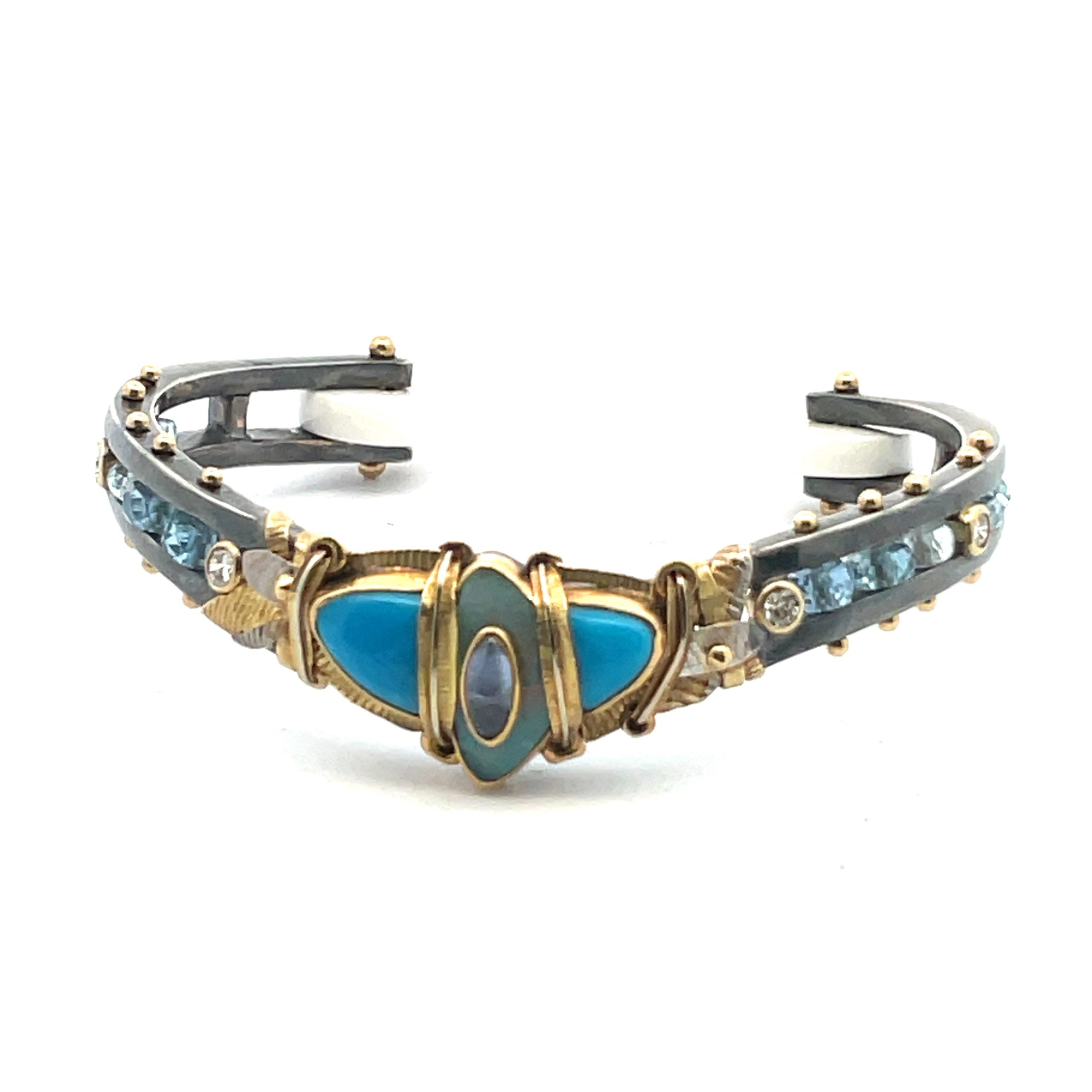 The best thing about a Michael Boyd bracelet? You can see every detail on your wrist every day! His chevron shape cuff is set at center with oval cabochon iolite over opal at center, flanked by bright blue gem silica, diamonds and, along the sides inset with aquamarine beads and diamonds. Boyd's signature 'wheels' at the tips -- coconut agate here - allow the cuff to slide on easily. Made with oxidized sterling silver, 22K gold, 18K gold and platinum. The bracelet measures 2" x 1/2" and fits up to a 6" wrist.