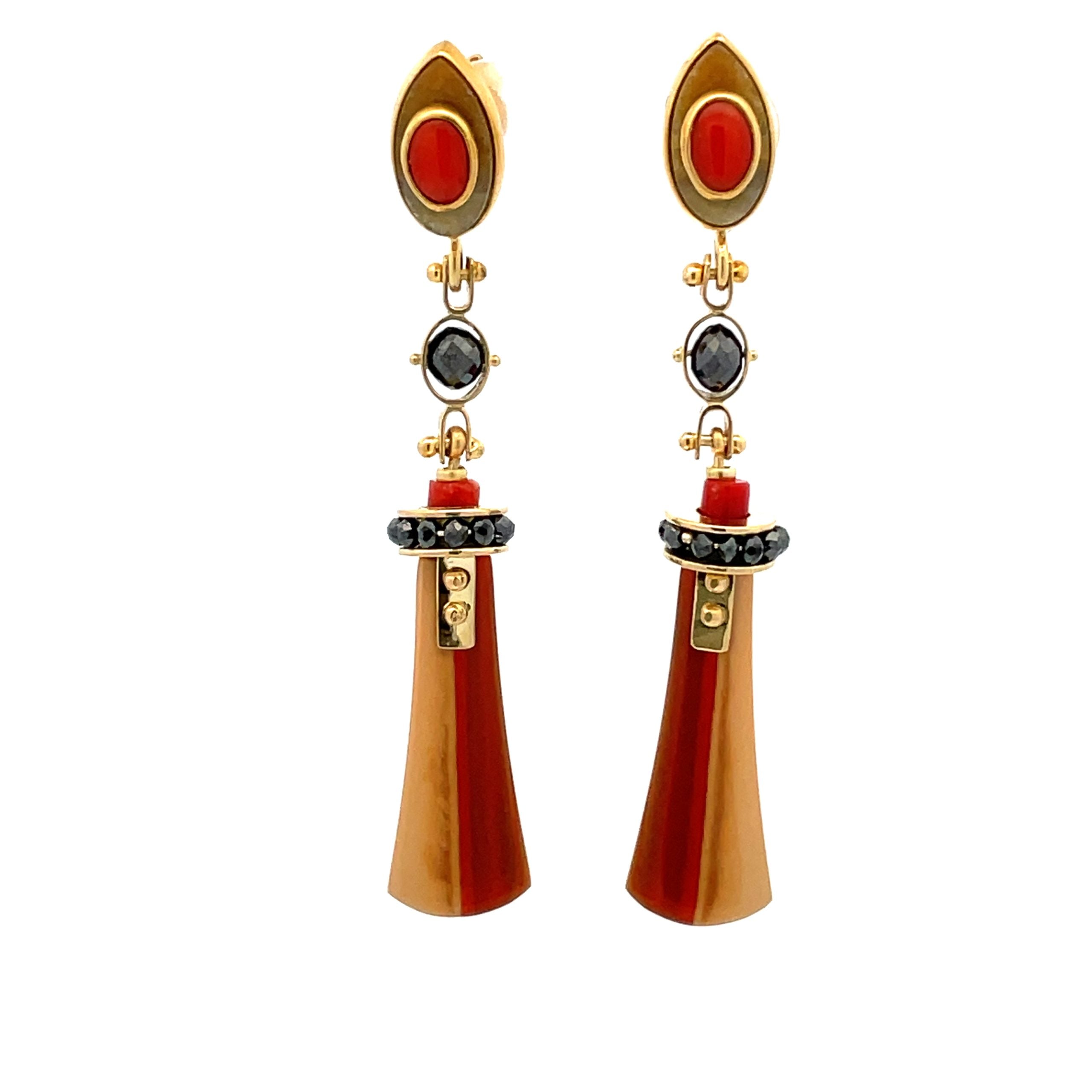 Diamond, coral and jadeite earrings from Michael Boyd are set at top with oval coral, center black diamond briolette, black diamond beads and a fan-shaped drop of Burmese yellow jadeite and Bruneau (Idaho) jasper, set in 18K and 22K golds. The earrings measure 1/4" x 2-1/4" long.