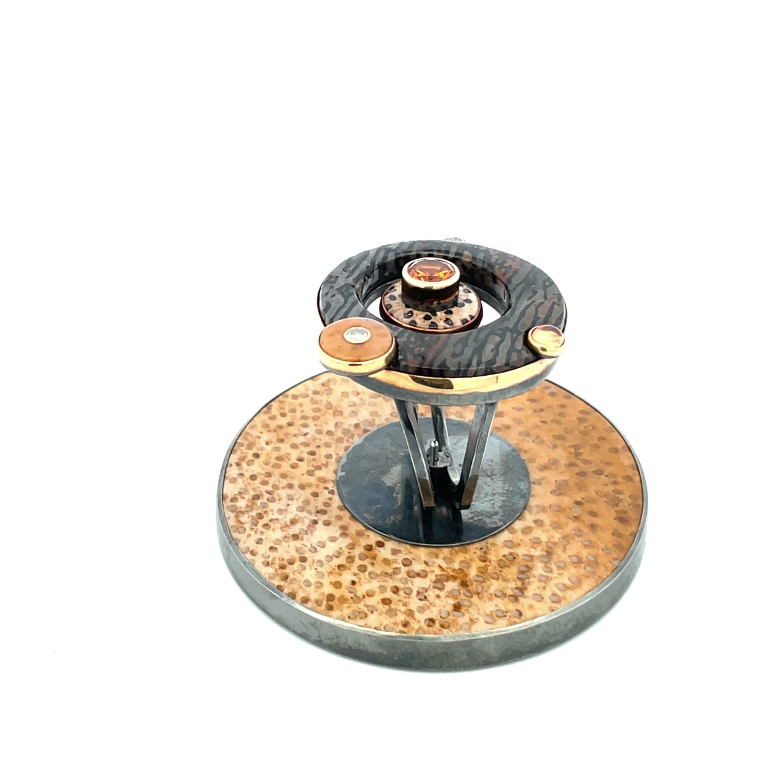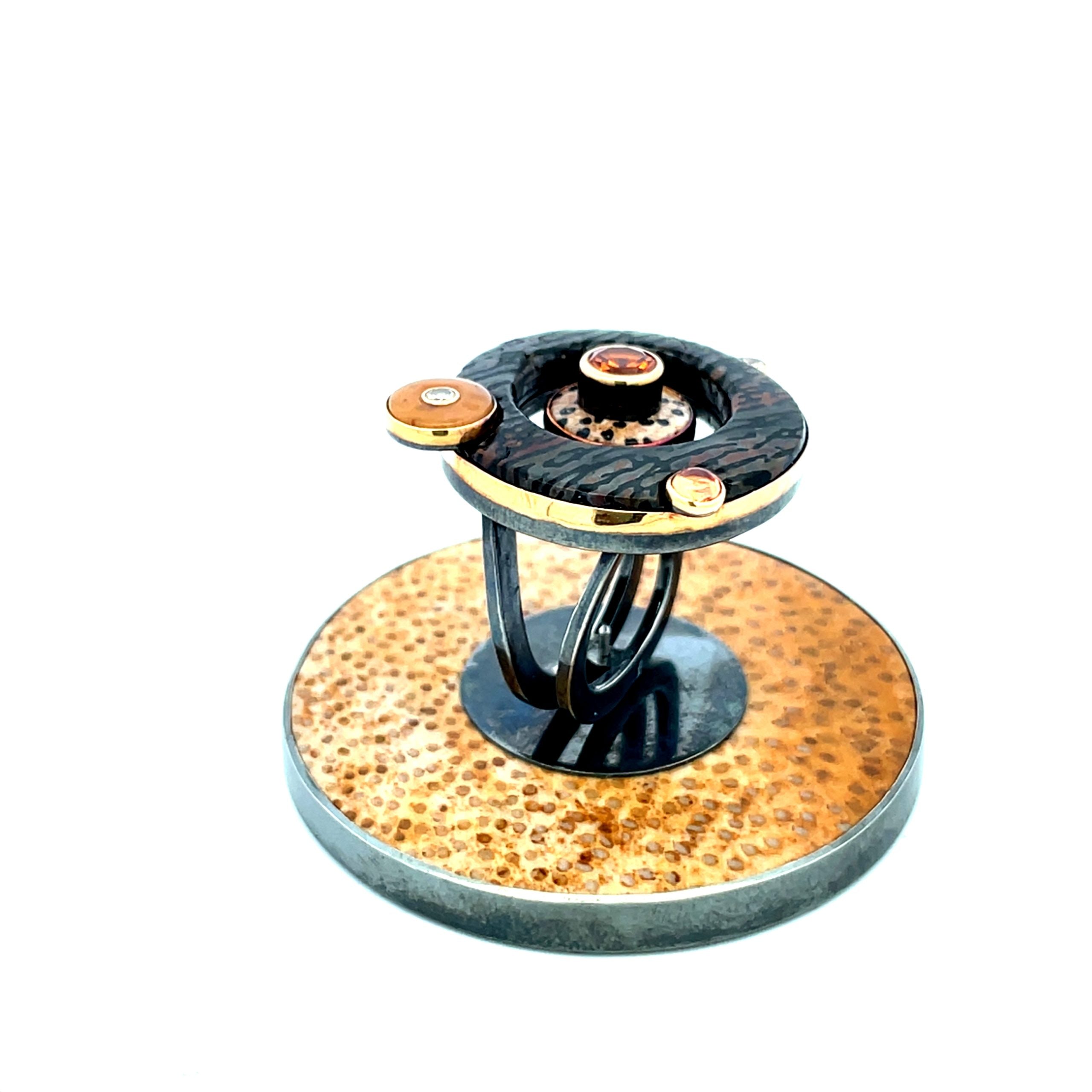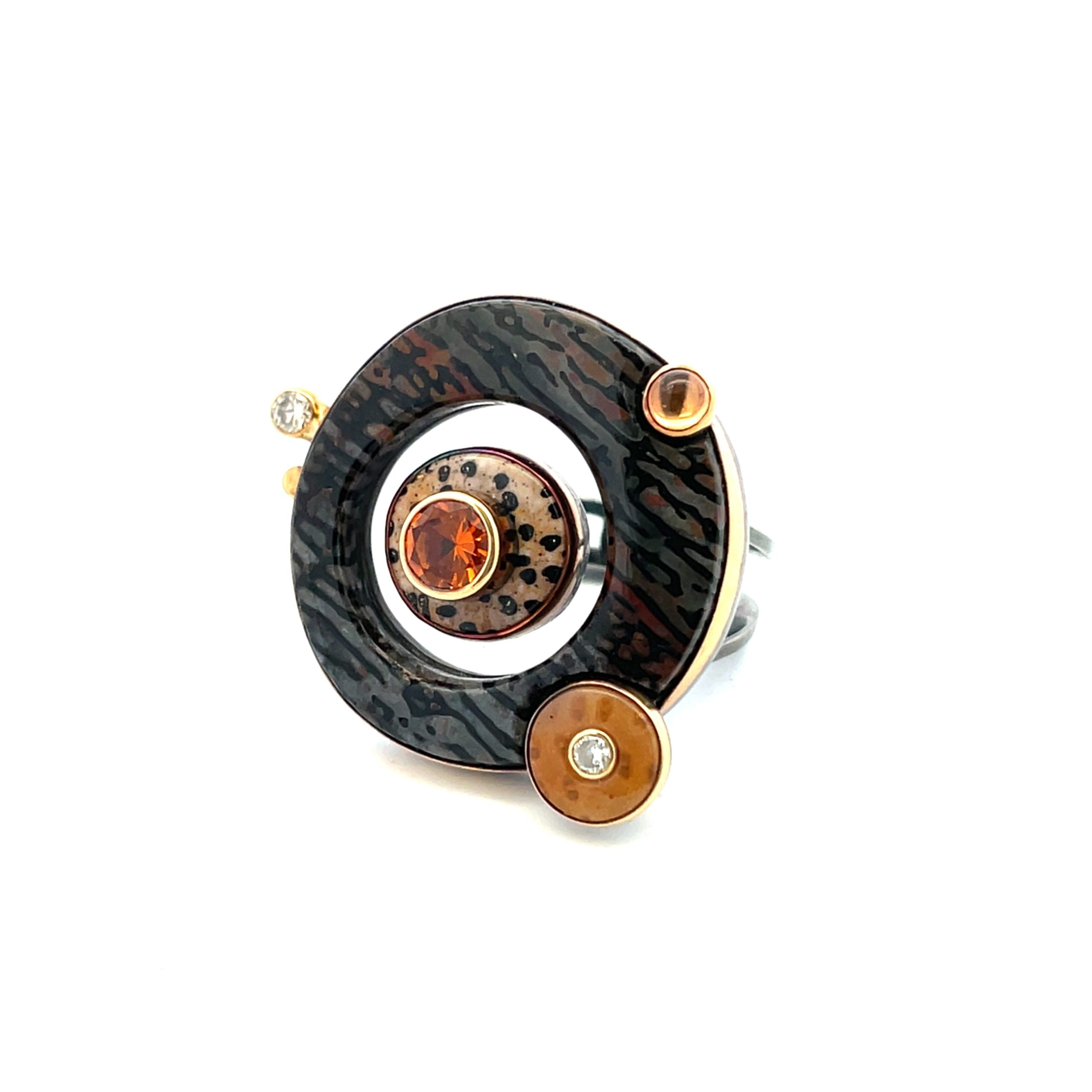 Michael Boyd's sculptured ring contrasts neutral shade fossilized gems -- dark striped dinosaur bone and light speckled palmwood -- with sparkling garnets, a center faceted 0.67 spessartite garnet and side cabochon hessonite orange garnet, set in 22K and 18K golds, with two diamonds, on an oxidized sterling silver setting. The ring is set on a ring stand of palmwood and oxidized sterling, when not being worn. The ring measures 1" in diameter and the stand is 1-7/8" diameter. The ring is size 6-1/2.