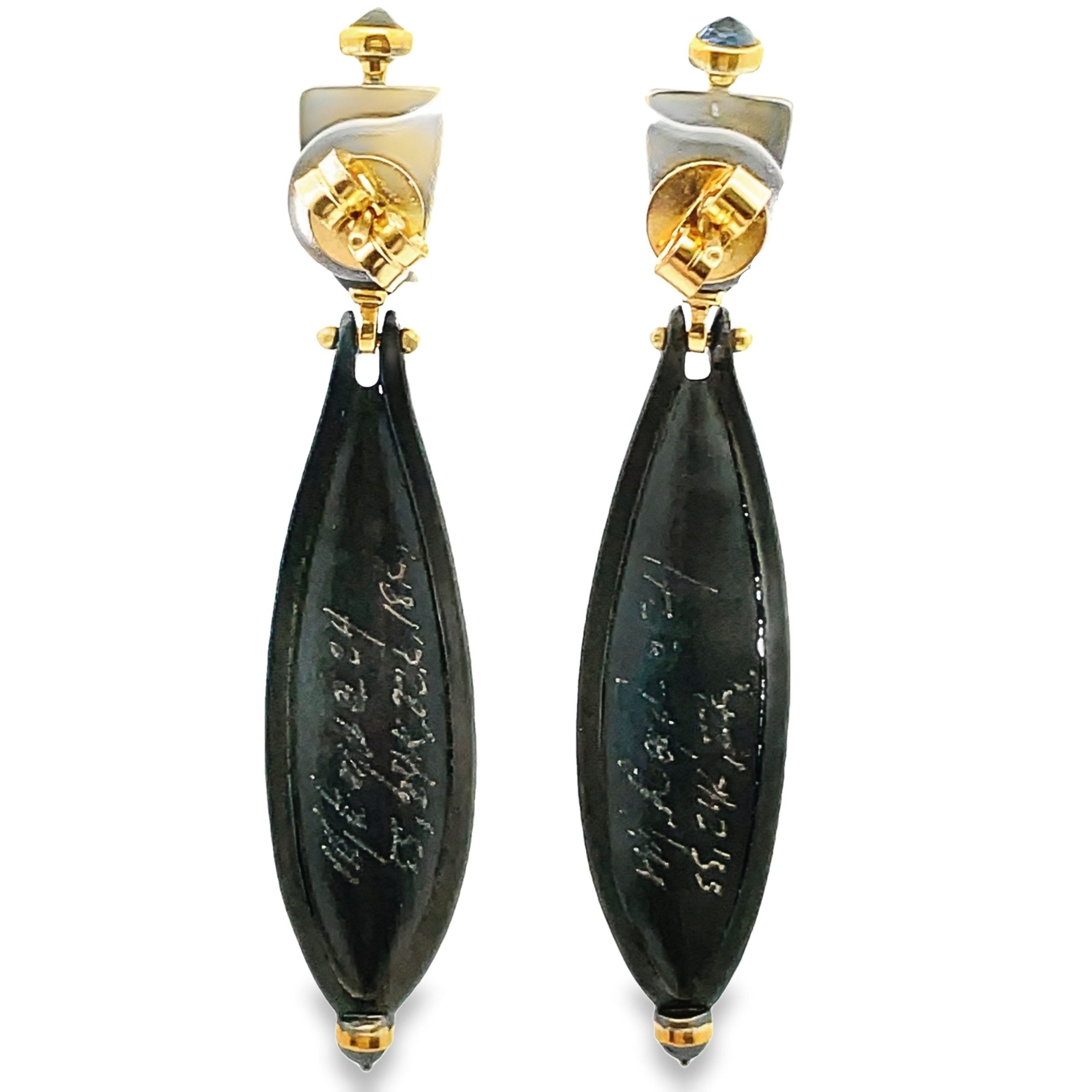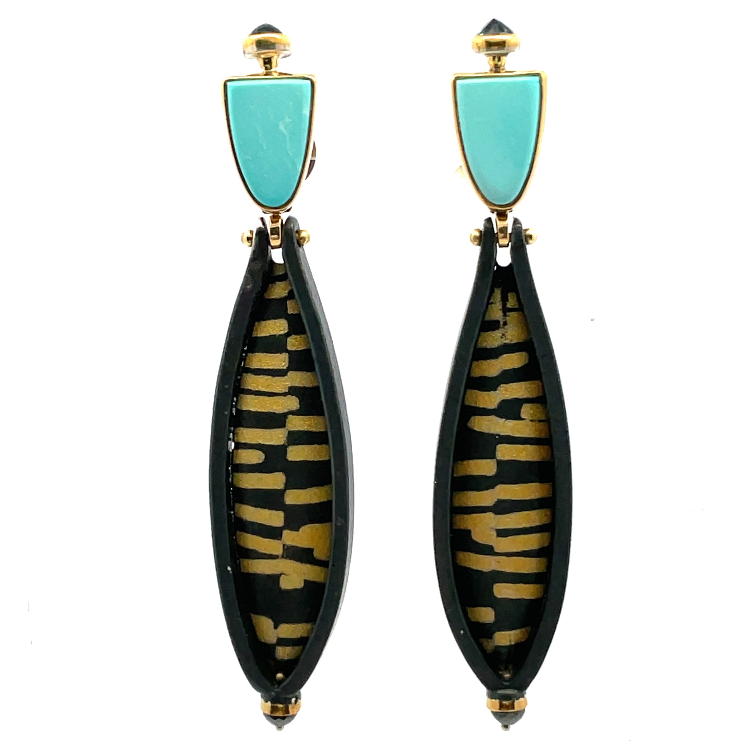 Michael Boyd's drop earrings are set at the very top with cabochon sapphires, with Persian turquoise and fabricated patterned silver and gold marquise drops framed in oxidized sterling with faceted black diamond bead tips. The earrings measure 3/8" at the widest x 2-1/8" long. The backs of the earrings are signed by the artist , dated 2024 and inscribed with the precious metal materials: ss,24k,22k,18k.