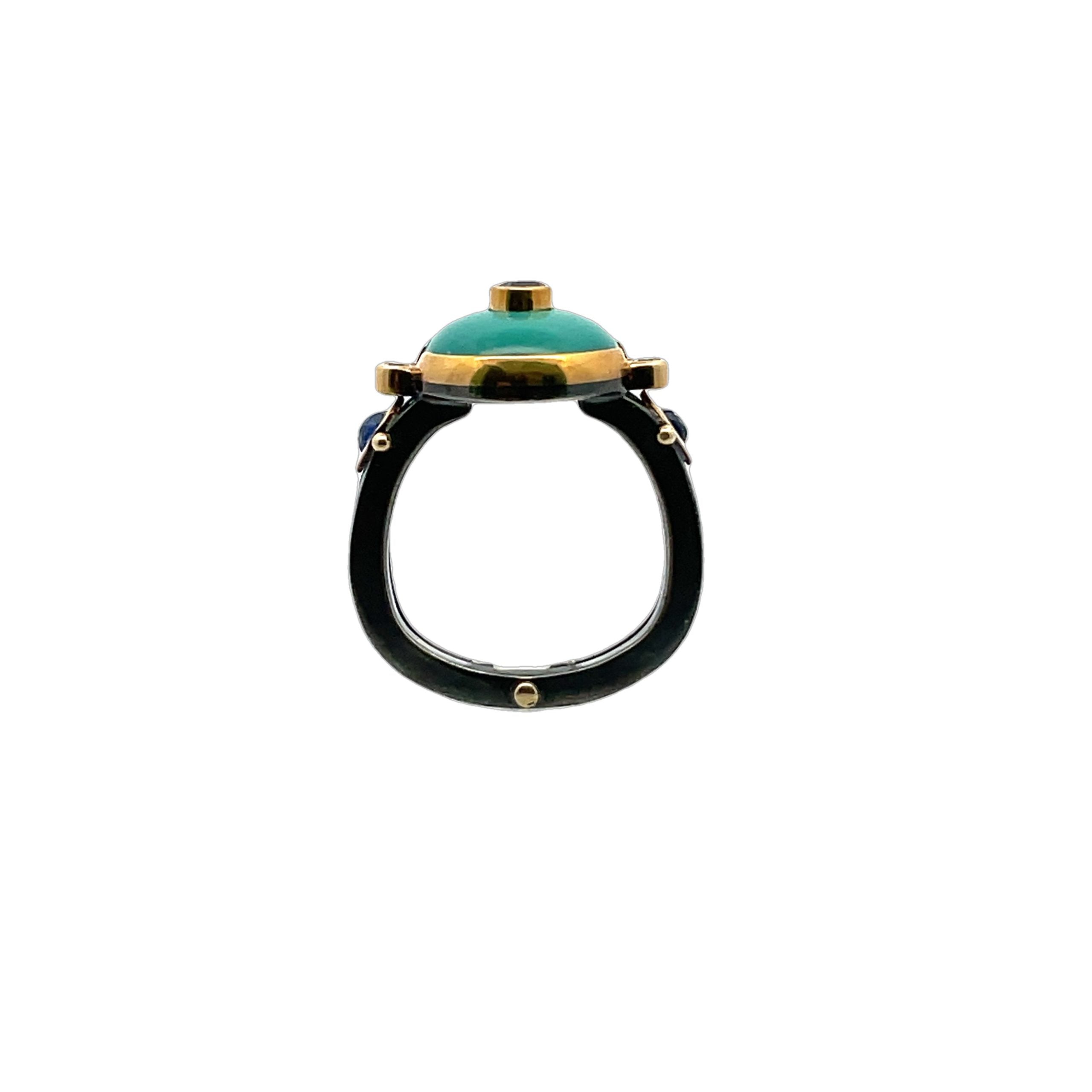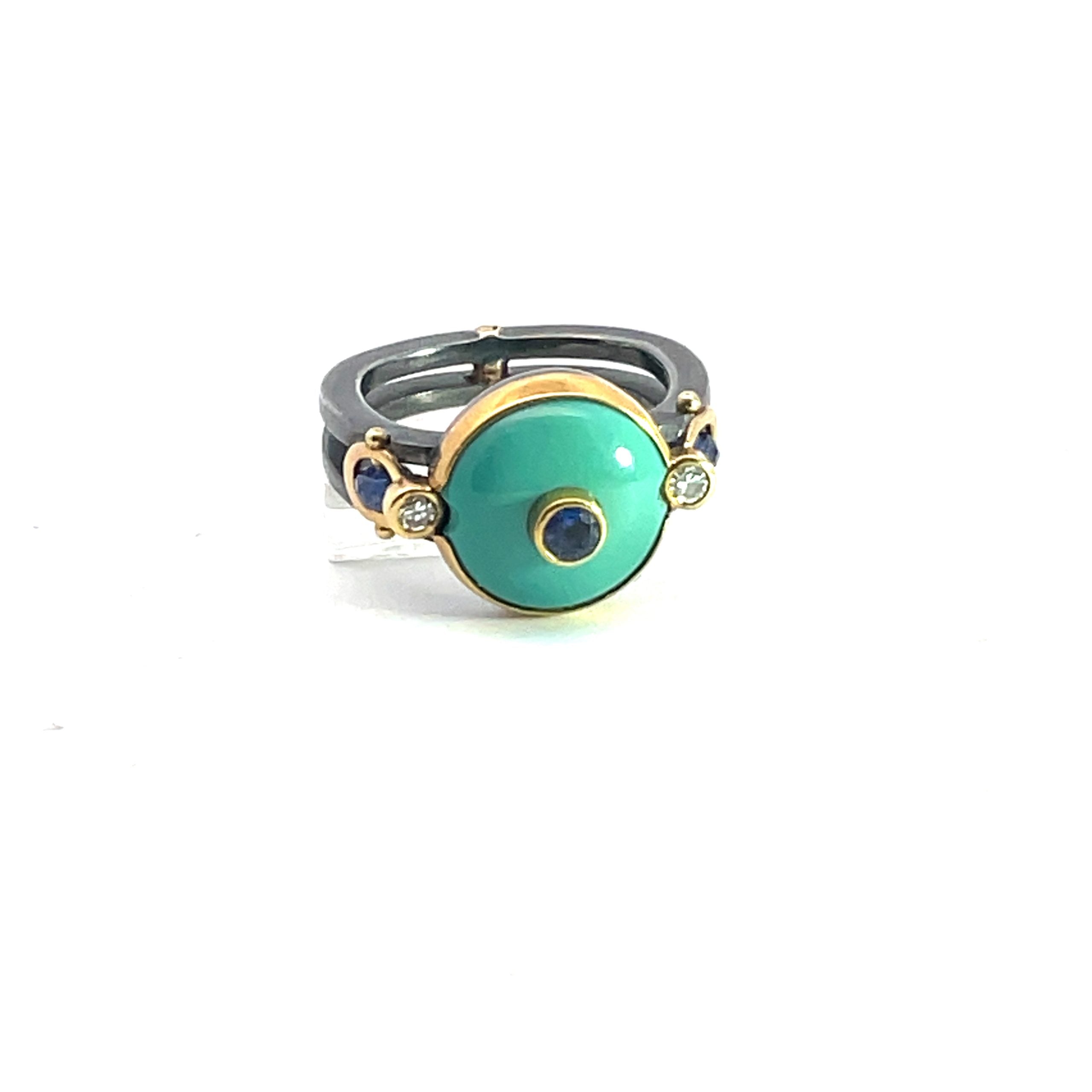 Michael Boyd a round cabochon turquoise at center, topped with a blue sapphire and accented by diamonds and blue sapphire beads at the side, all set in 22K gold. The oxidized sterling silver double-shank ring measures 3/4" x 1/2" and is size 5.5.