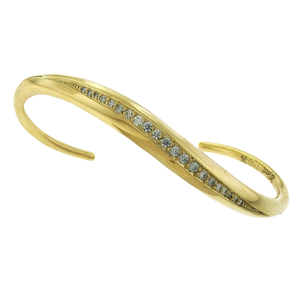 Nothing could be better than wearing a wrist-hugging curve of 18K gold by Michael Good, except wearing a wrist-hugging curve of gold pavé-set with 0.35 cts diamonds so that the diamonds appear to have grown in the gold. Good's Wave cuff bracelet fits like a gentle touch on one's wrist, only 1/4" wide. Fits small to medium wrists, can be made for any size.