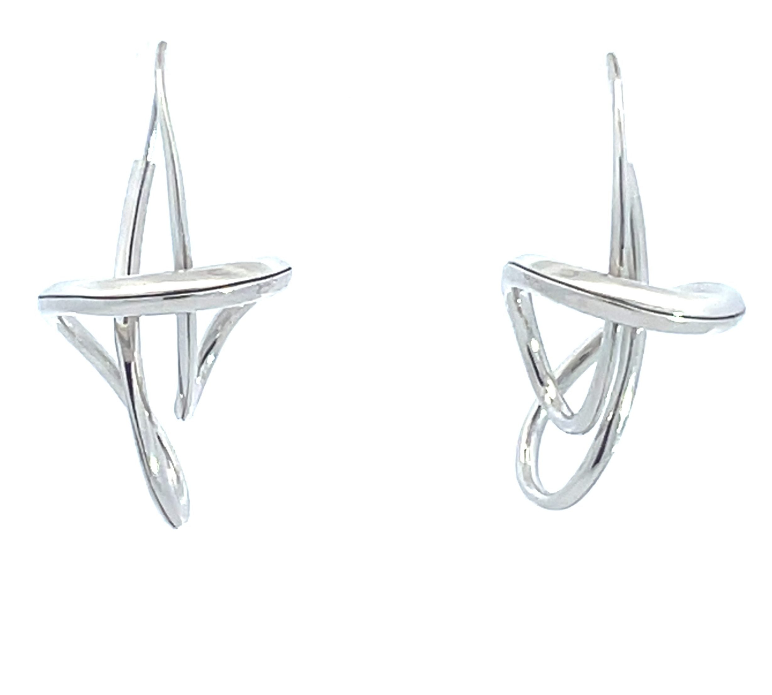 A rare find from a private estate! Platinum earrings by Michael Good, circa 2000, triple looped in a variation of the Zahna earring. The earrings each measure 7/8" in diameter x 1-1/2" long. In excellent condition and a remarkable feat of craftsmanship as they are formed from a single sheet of platinum curled around to create a three-dimensional mobile for the ear.