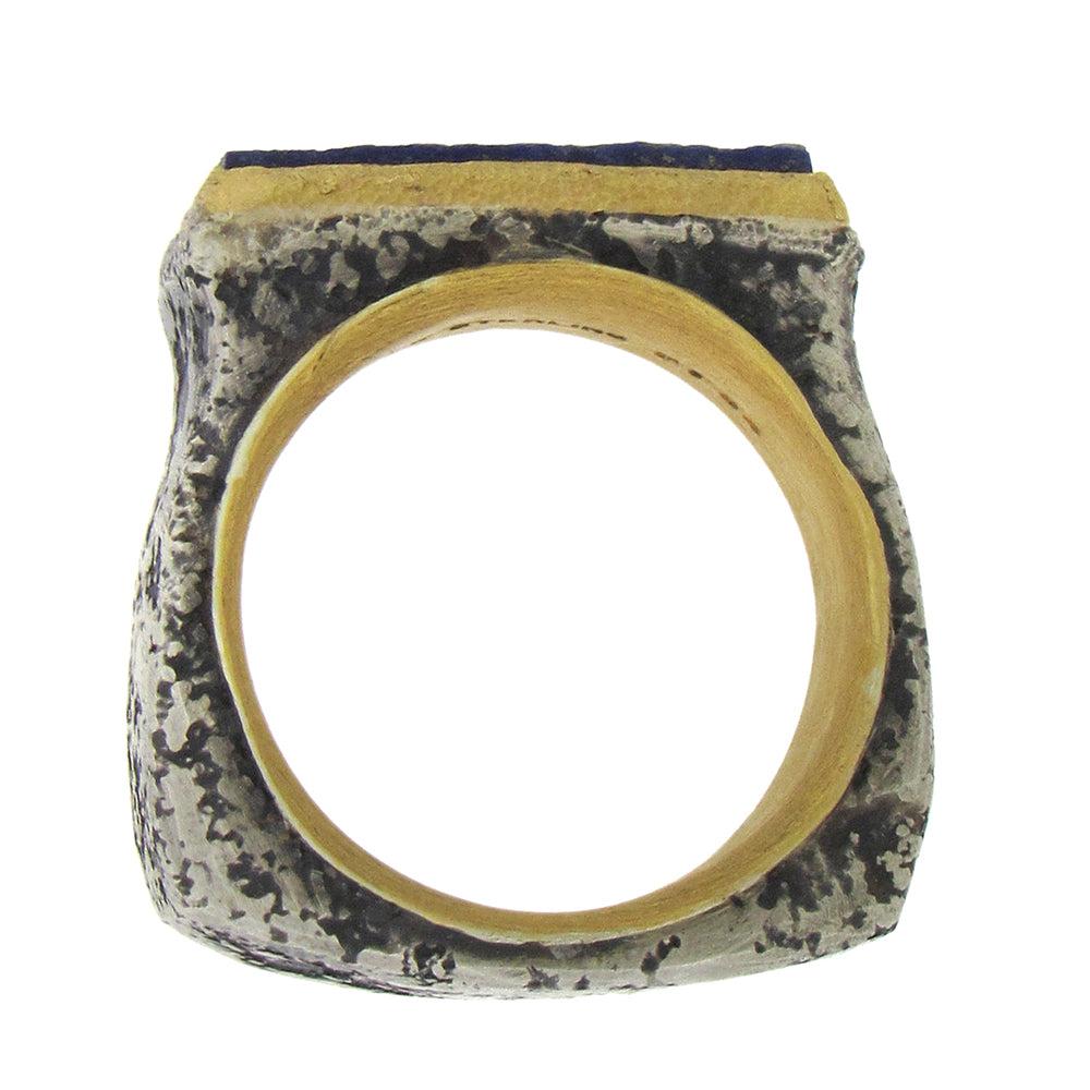 Wear it everywhere, Michael Jensen's 'Vetus' ring, the raw natural rectangular lapis lazuli set horizontally in 22K gold with oxidized textured sterling silver comfort-lined with 22K gold. The ring measures 3/4" x 1/4", size 7.