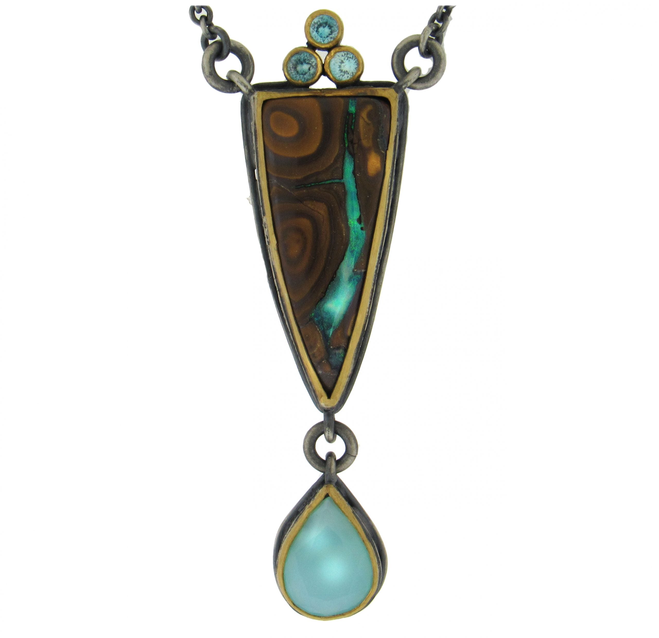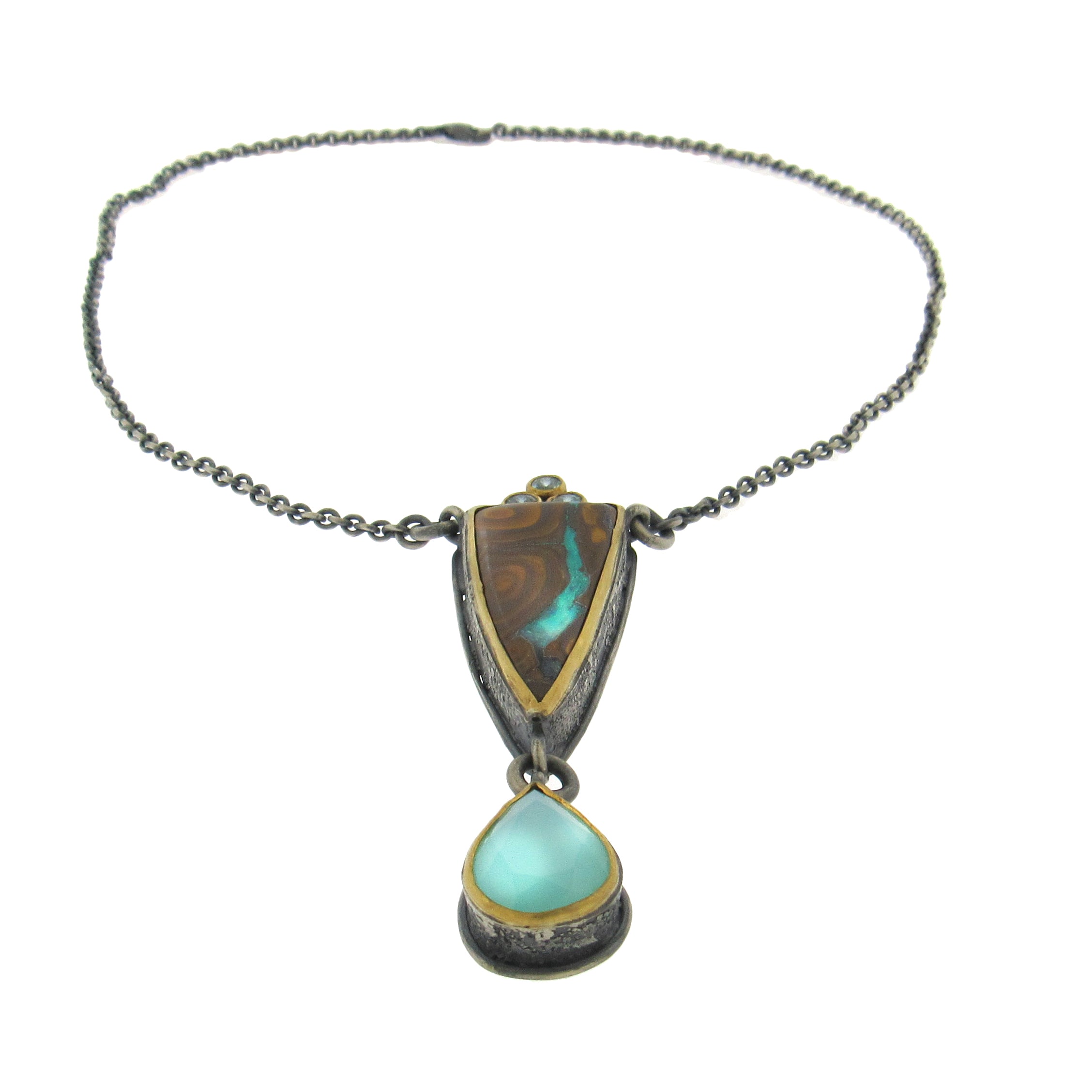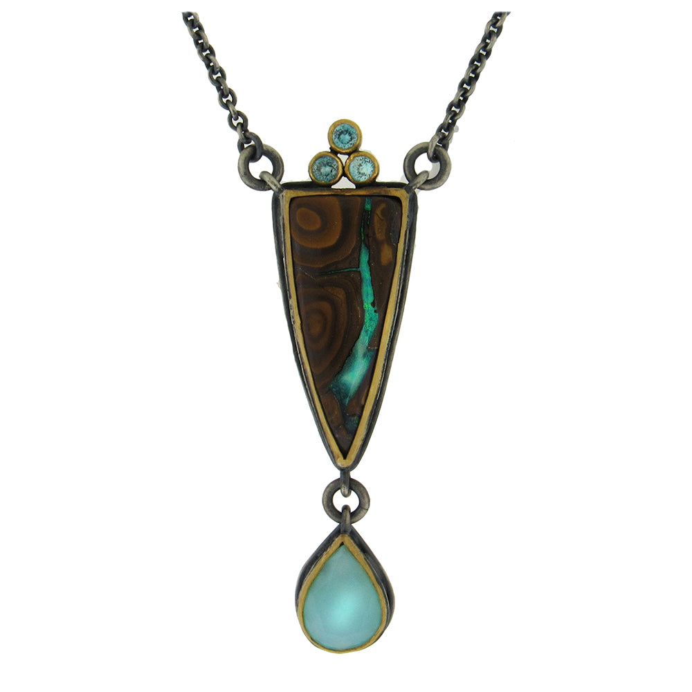 Michael Jensen's pendant/necklace is centered with a 23.62 Australian boulder opal with its brilliant blue opalescent crevasse slicing through the matrix, a paer-shape blue gem silica drop, 4.39ct, and three faceted soft blue zircons, 1.09 cts tw. The pendant measures 3/4" at the widest x 2-7/8" long, the oxidized sterling necklace chain is 17" long.