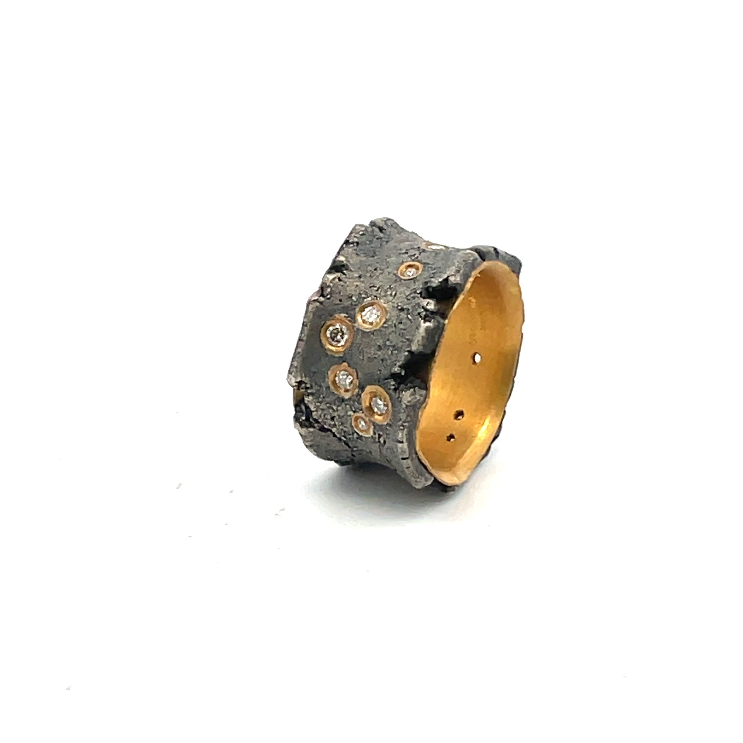 Michael Jensen's 'Talentum' diamond band for men or women, the 16 round brilliant diamonds, 0.55 cts tw, set in 22K gold bezels in Jensen's signature distressed sterling inlaid with 22K gold. The ring measures 7/8" x 1/2" wide (14mm) and is size 7.75.