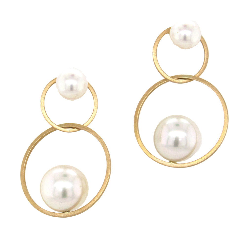 Intersecting pearls from Japanese goldsmith Momoko Kumai sets a 12mm South Sea pearl and a 8mm Akoya pearl in in a drop earring full of motion and elegance. The 18K gold earrings measure 7/8" x 1-1/4".