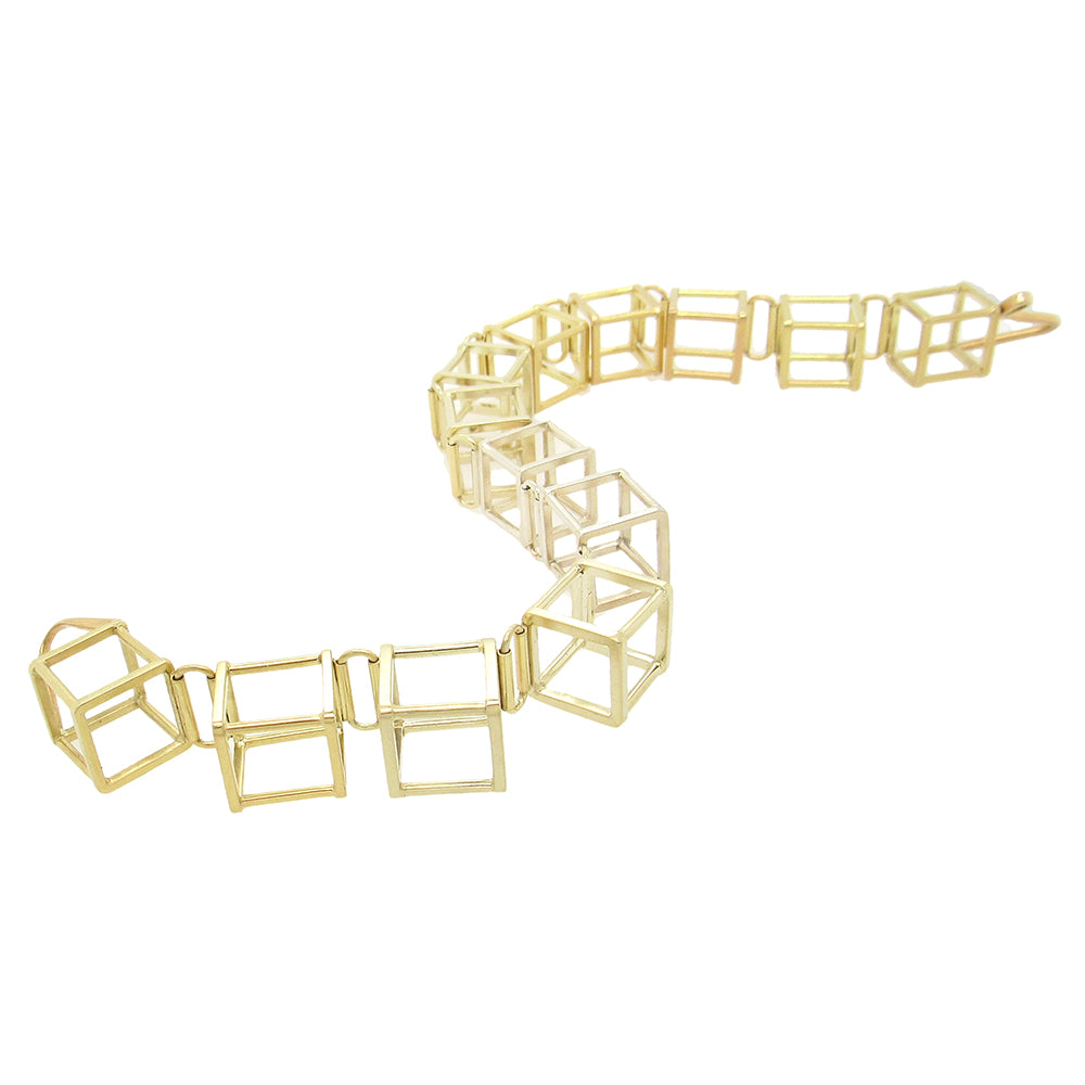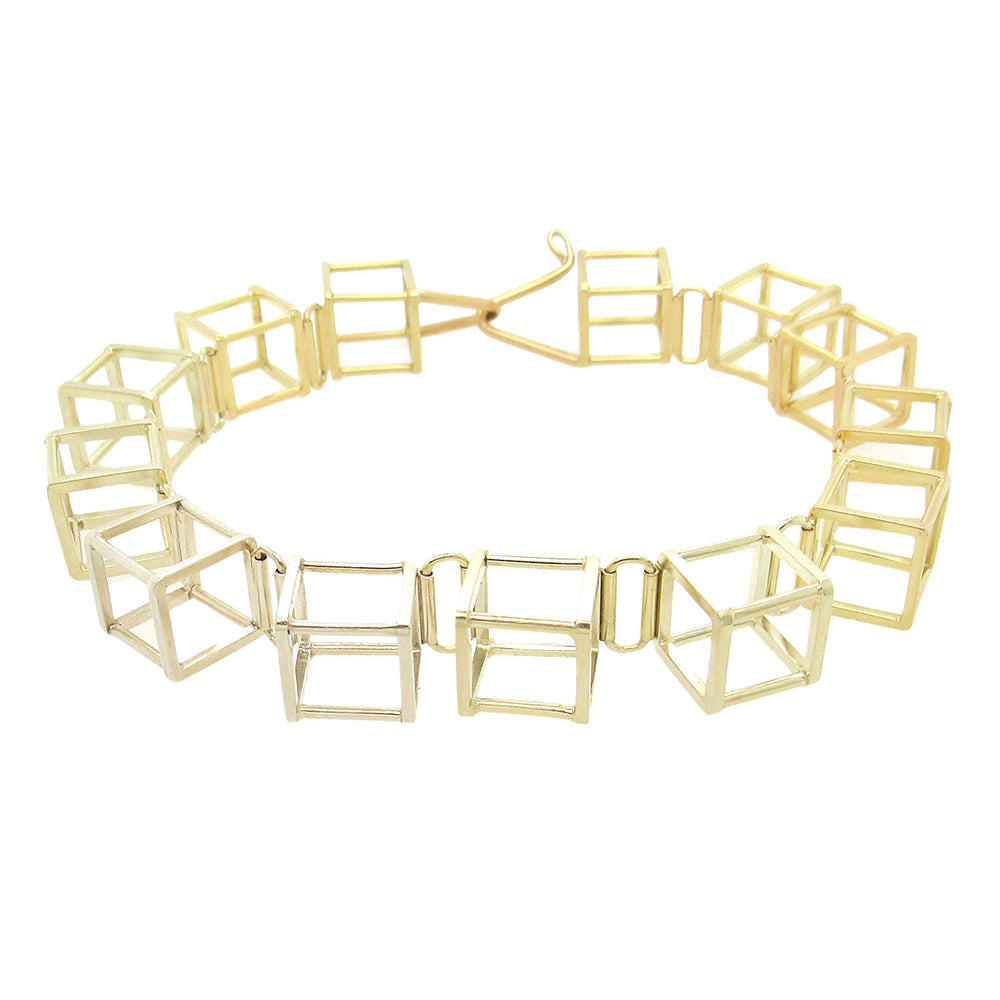 Japanese goldsmith Momoko Kumai links thirteen cascading open cube links, each 9mm square, in an 7.25" long bracelet.