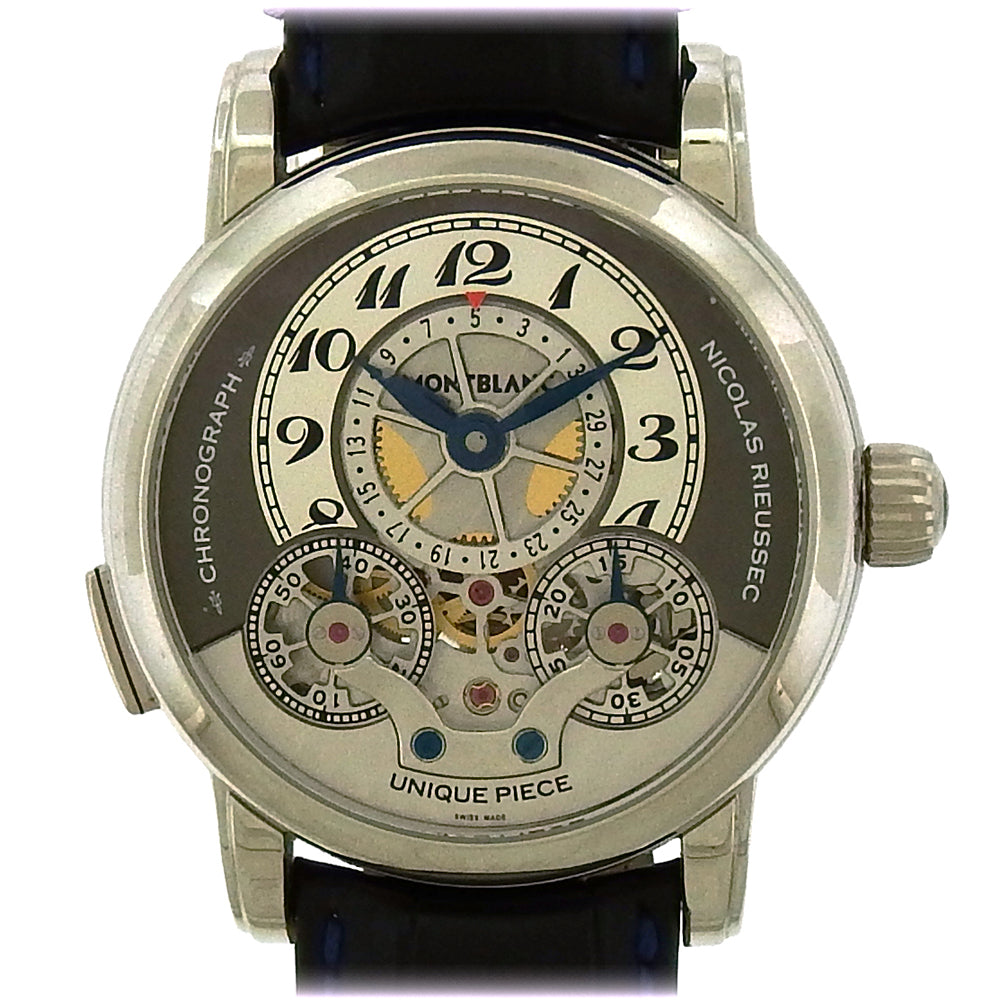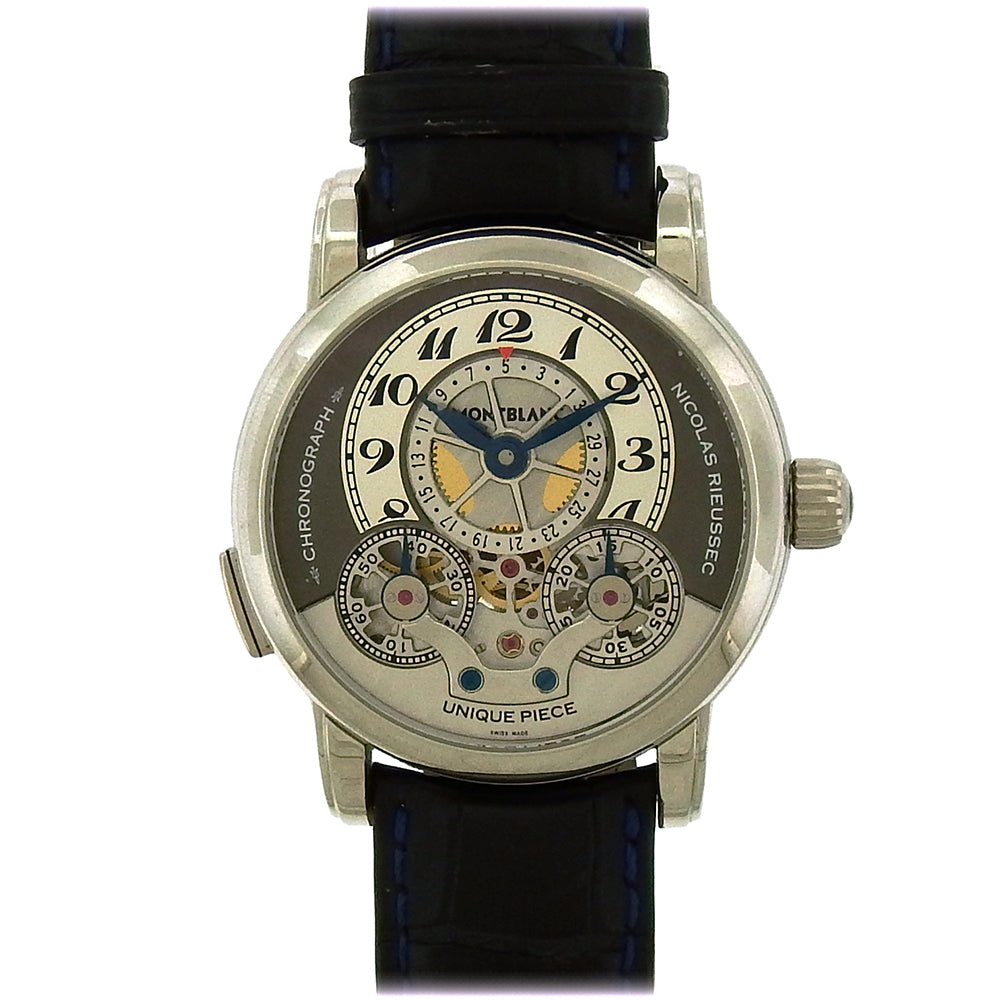 Unique platinum Mont Blanc chronograph made in 2009 by Nicolas Rieussec for the legendary Only Watch charity auction in Monaco,this 42.5mm platinum skeletonized chronograph from Mont Blanc features a single button at 8 o'clock that activates the skeletonized chrono hand at 8,with the 30 minutes register at 5. Rieussac's design is brilliantly counter-intuitive,with the hand remaining still while the rotor turns and the 30 minute counter moves counter clockwise to record the elapsed time. The skeltonized date wheel is at center 12,with the hours register at the top. A brilliant complication hand built in platinum,leather strap,deployant,complete with box,papers and provenance. The manual wind movement is warrantied for 2 years by Aaron Faber.