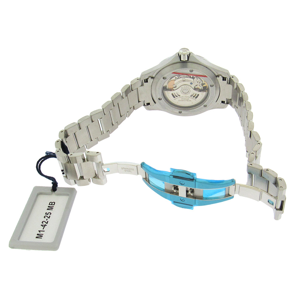 Stainless steel Muhle Glashutte ProMare Lady automatic sports watch is a 42mm round center second wristwatch with a white enamel bezel, see-through sapphire back, 30 meter water resistance, mother-of-pearl dial with diamond quarter hour markers and date at 3 o'clock. The automatic movement is warrantied by Muhle for two years.