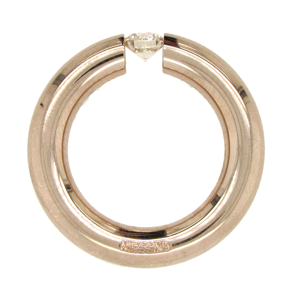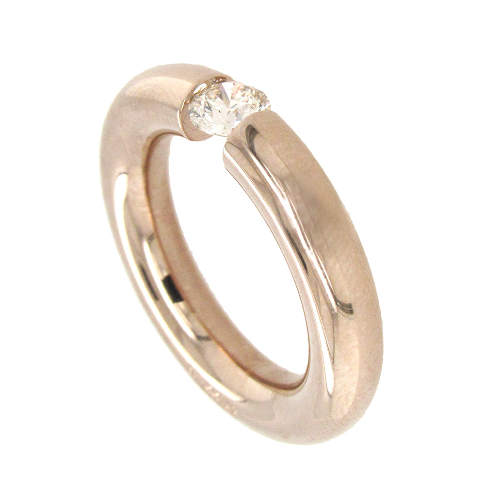 18K rosewood gold by Niessing round tension set solitaire, set with 0.50 VVS1 faint brown diamond, GIA certificate, with glossy finish. The ring is 4.5mm and is a size 7. Niessing is famed for their 17 colorful alloys of gold, and this is one of them, named rosewood. Their tension-set rings can be ordered in any color.
