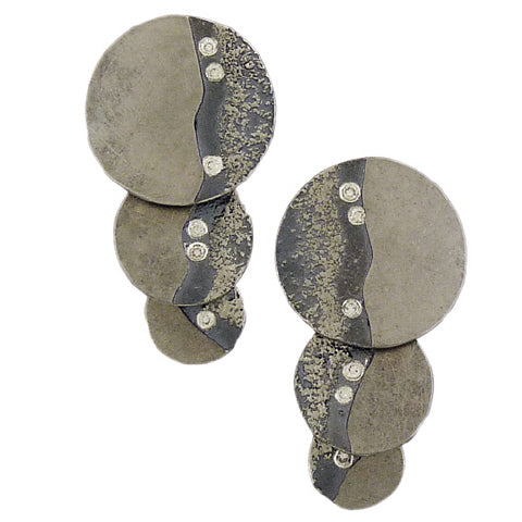 Movement -- real and implied -- is central to the seductive appeal of Peter Schmid's jewelry. Here, graduated circles of palladium and sterling are hinged to move with the wearer, but movement is also visualized in the contrasting textured and smooth surfaces and the rippled centers, set with diamonds. 18K gold post backs.