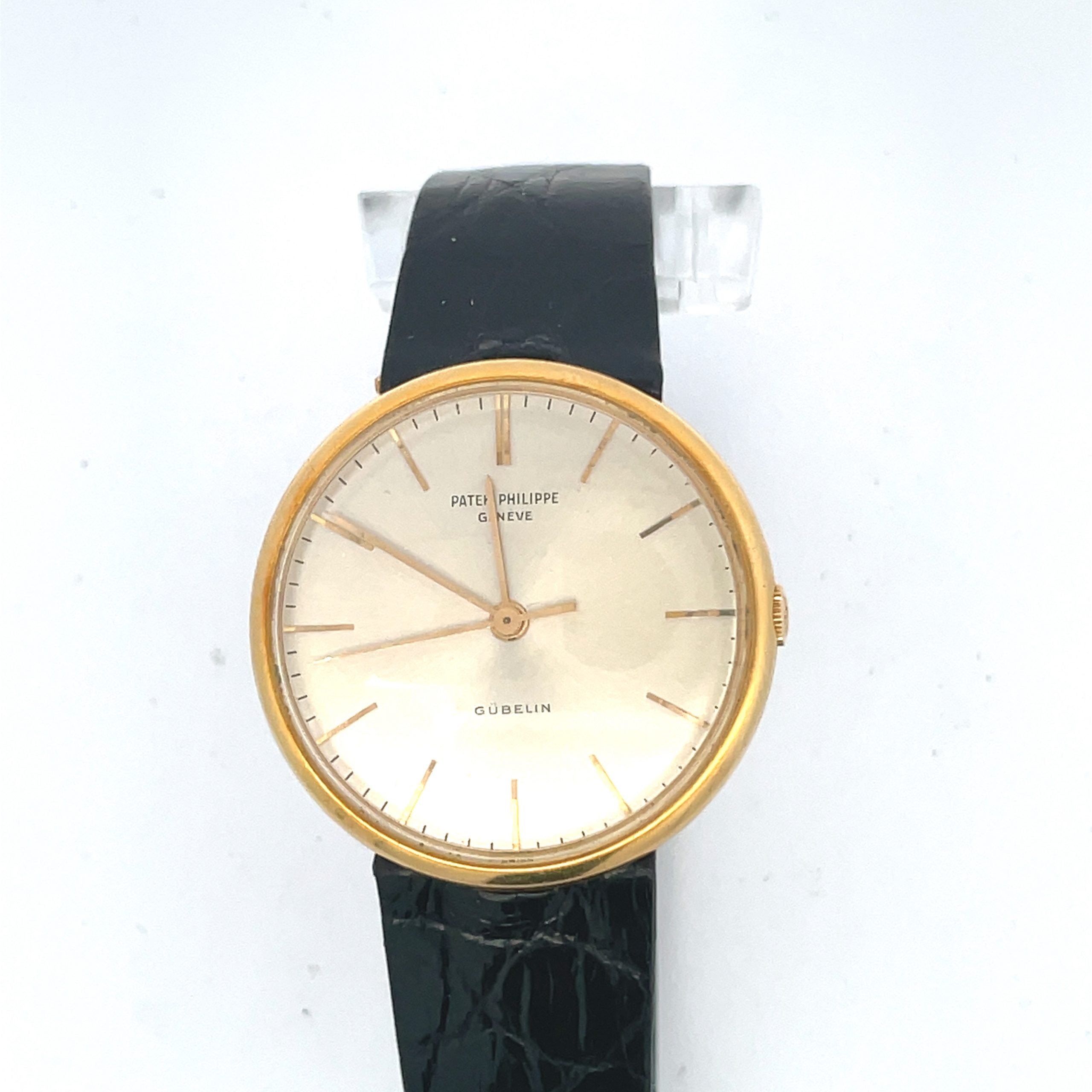 Patek Philippe Ref. 3495 'Disco Volante' Calatrava, circa 1960's, is a 36mm rare, center seconds, 18K.yellow gold wristwatch with an 18K yellow gold Patek buckle and PPC strap. The round slim lentil-shape case -- hence the sobriquet 'Flying Saucer' -- is 36mm, with rounded bezel, hooded lugs and recessed winding crown, satin silver dial with Swiss retailer Gubelin on dial, applied yellow gold baton indexes, outer minute/seconds divisions, yellow gold baton hands. The caliber 27SC movement is warrantied by Aaron Faber for 2 years. With Extract from the Archives of Patek Philippe.
