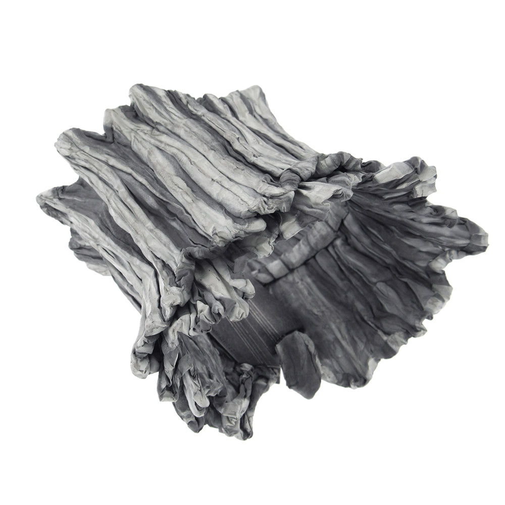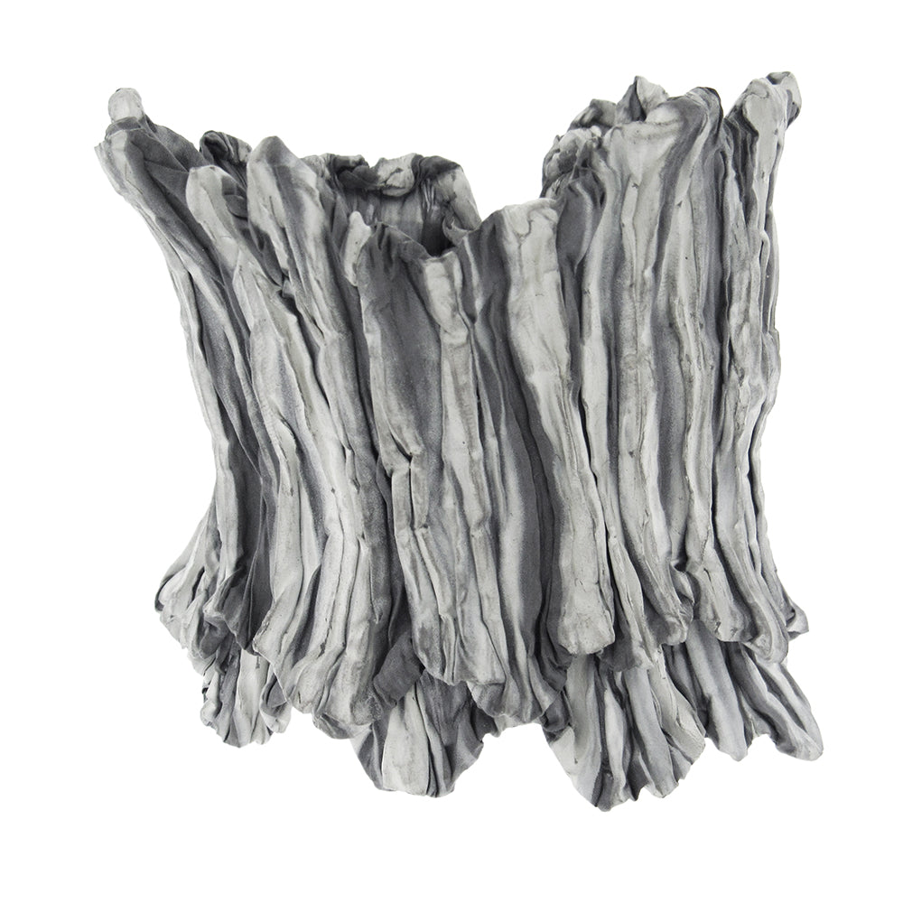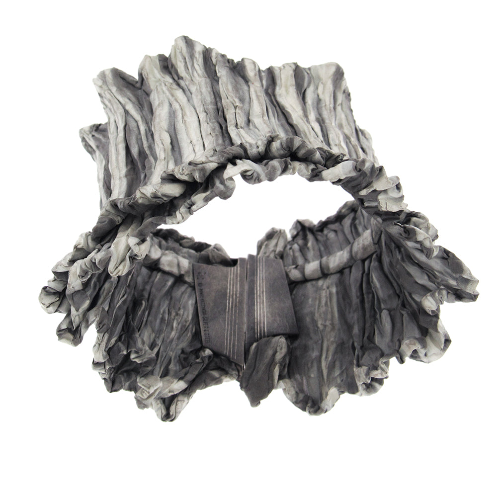 Pavel Kaczynski's silvery patinated ruffle bracelet in stainless steel mesh is a double-tiered circle of pleated and folded stainless steel mesh, ranging in width from 2-1/2" to nearly 3", its irregular ruffled edge capturing the feel of fabric. The sterling silver oxidized ombre clasp is magnetic.