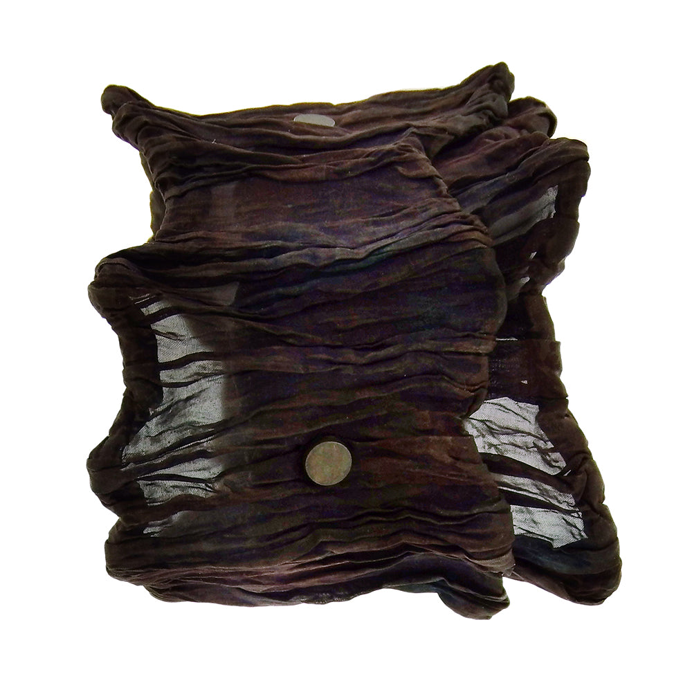 Pavel Kaczynski's patinated ruffle bracelet in shades of aubergine and deep blue is double-tiered wrap of pleated and folded stainless steel mesh, ranging in width from 2-1/2" to nearly 3", its irregular ruffled edge capturing the feel of fabric. The sterling silver oxidized clasp is magnetic.