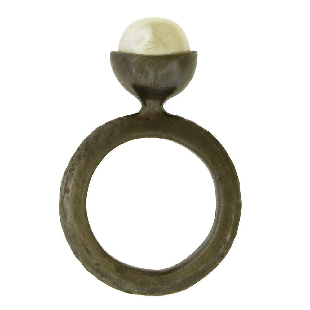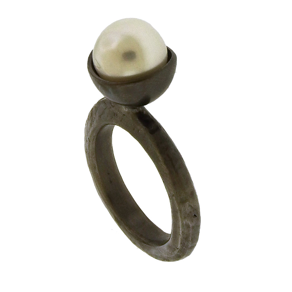 Minimalist and magical, a 10mm pearls sits at top of this handmade oxidized sterling silver ring. Measures 3/8" diameter, 1/2" above the hand.