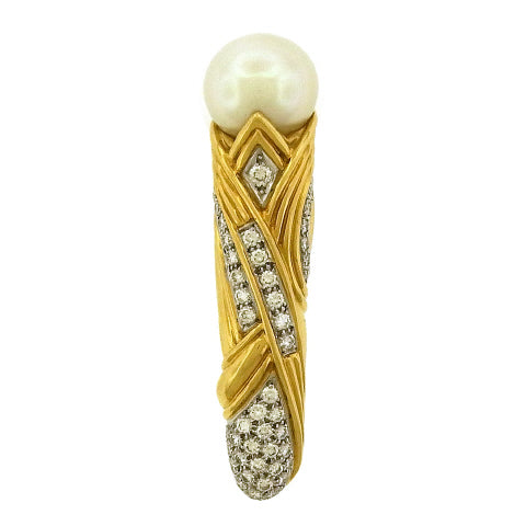 Lustrous silver-white 13mm pearl is set in a cocooned Deco-style mounting of 18K gold and diamond in a torchiere style. Brooch measures 1/2" x 2".