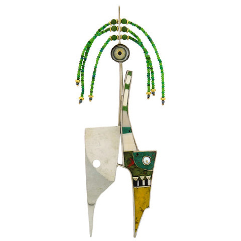 Tod Pardon's 'Pendastu' brooch/sculpture is 6-5/8" tall, a mixed media composition in sterling silver and 14K gold, inlaid with bone, pearl, pigmented green and yellow glass, wood, a glass eye, and a headdress of green glass and gold beads.