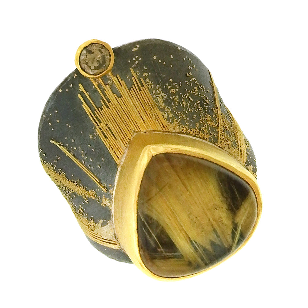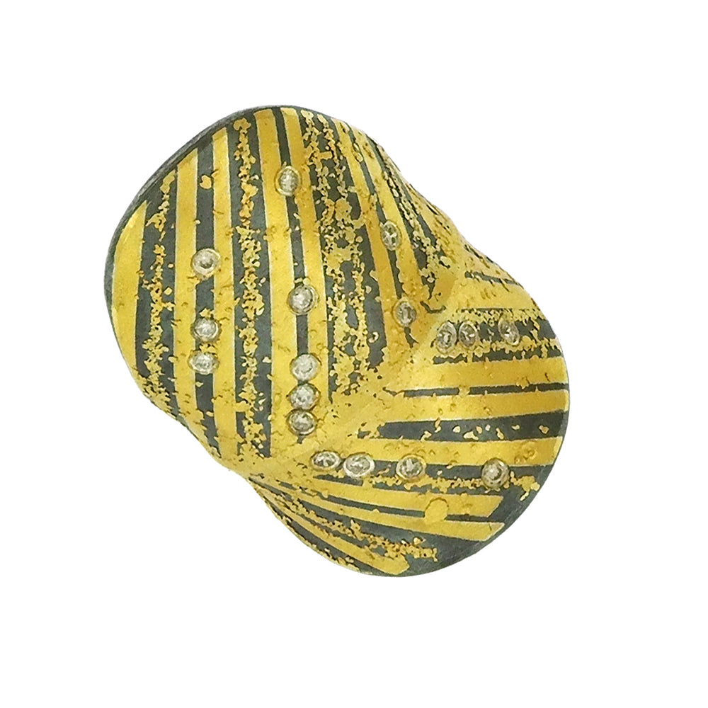 Atelier Zobel has long been known for these 'cigar band' style rings, bold and comfortable. This elongated ring with in oxidized sterling and 24K gold in diagonal stripes measures 7/8" x 1-1/8" long, the elongated form accented with 0.17 cts diamonds, ring size 7.25.