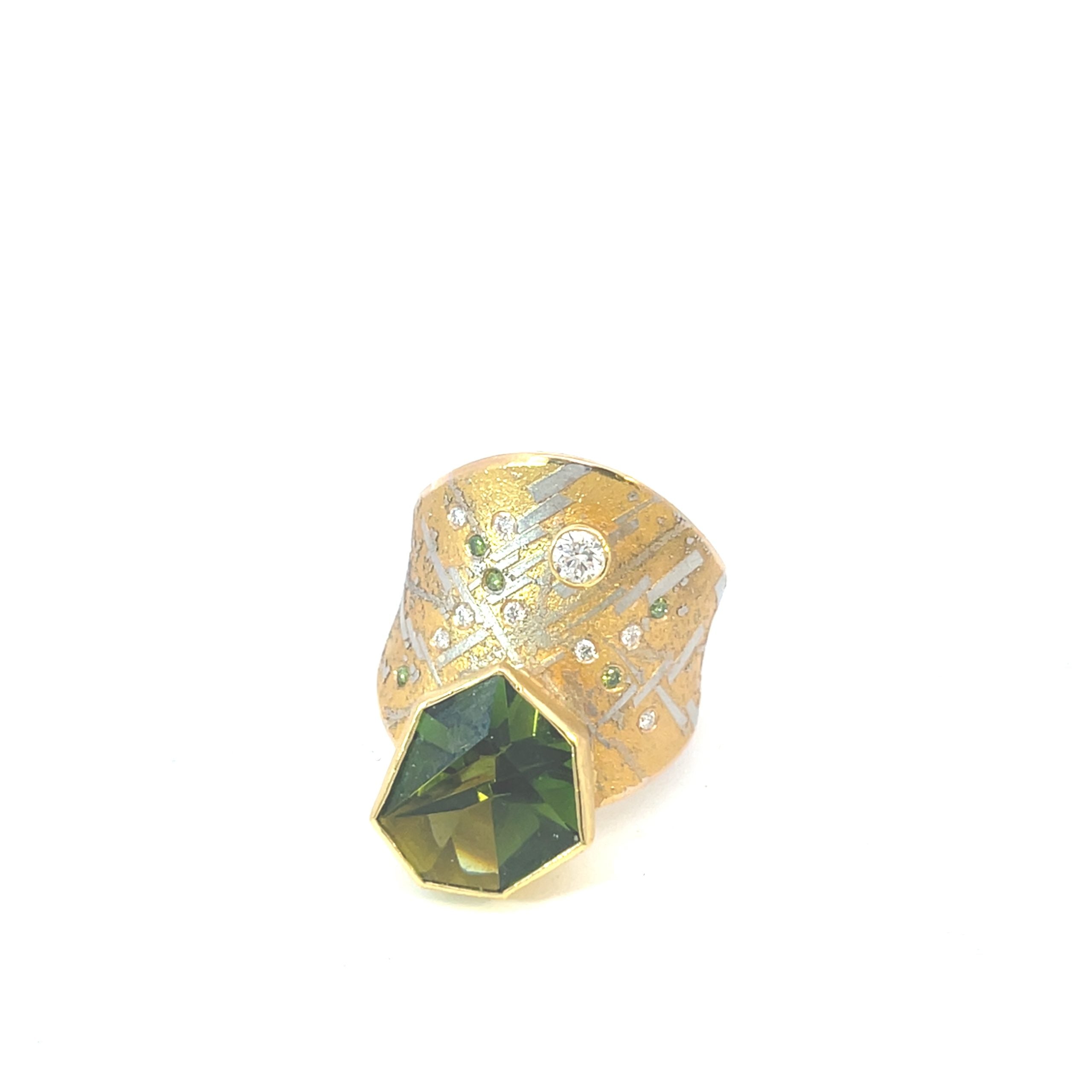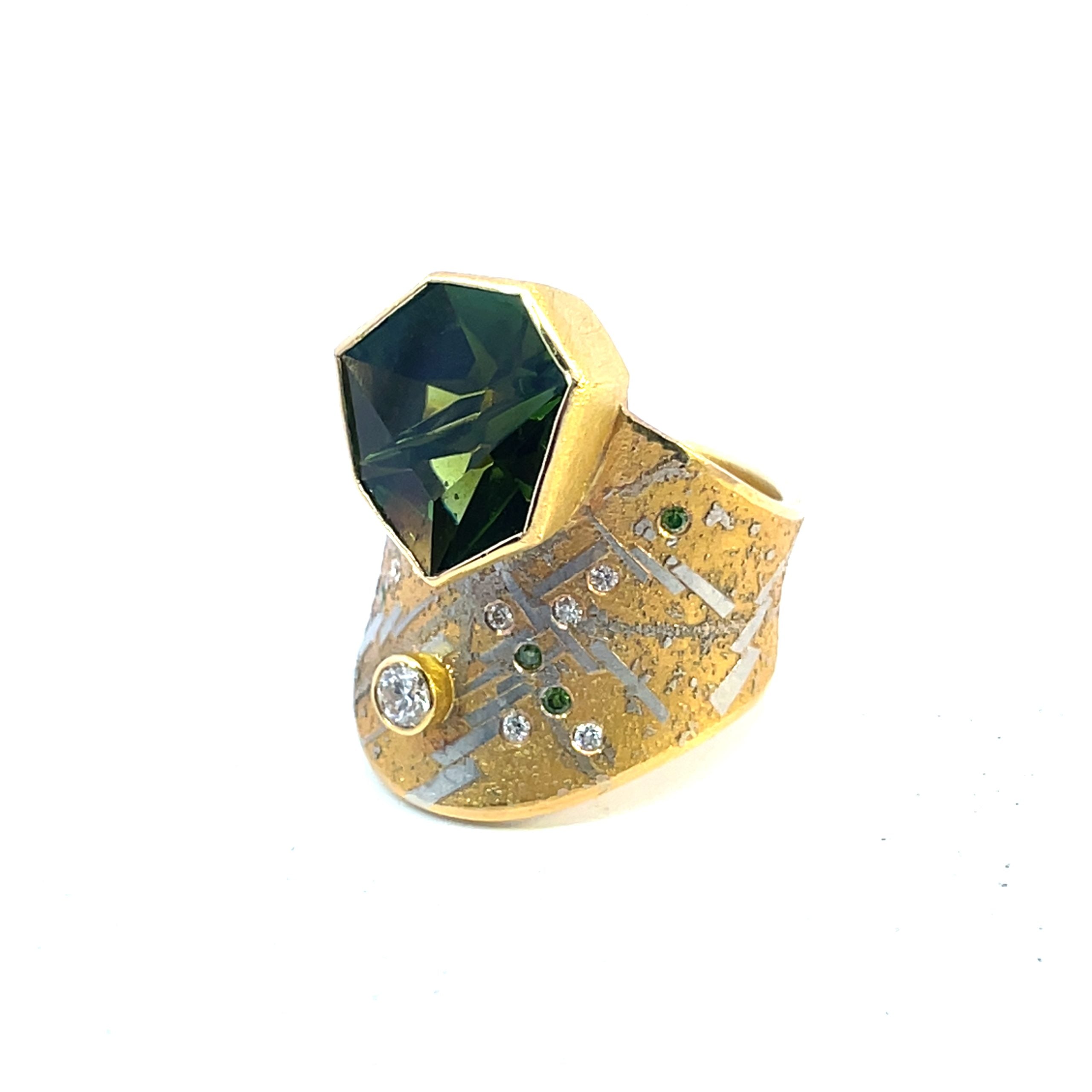 Peter Schmid and Tom Munsteiner collaborated independently, as many jewelry artists do, drawing inspiration from the gemstones. Here, Peter designs a signature cigar-style ring in 18K, 22K, and platinum, set with Tom's iconic Prism-cut, a 5.52 carat green tourmaline, accented with diamonds, 0.28 cts tw. The ring measures 7/8" x 1-1/8" and is size 8.