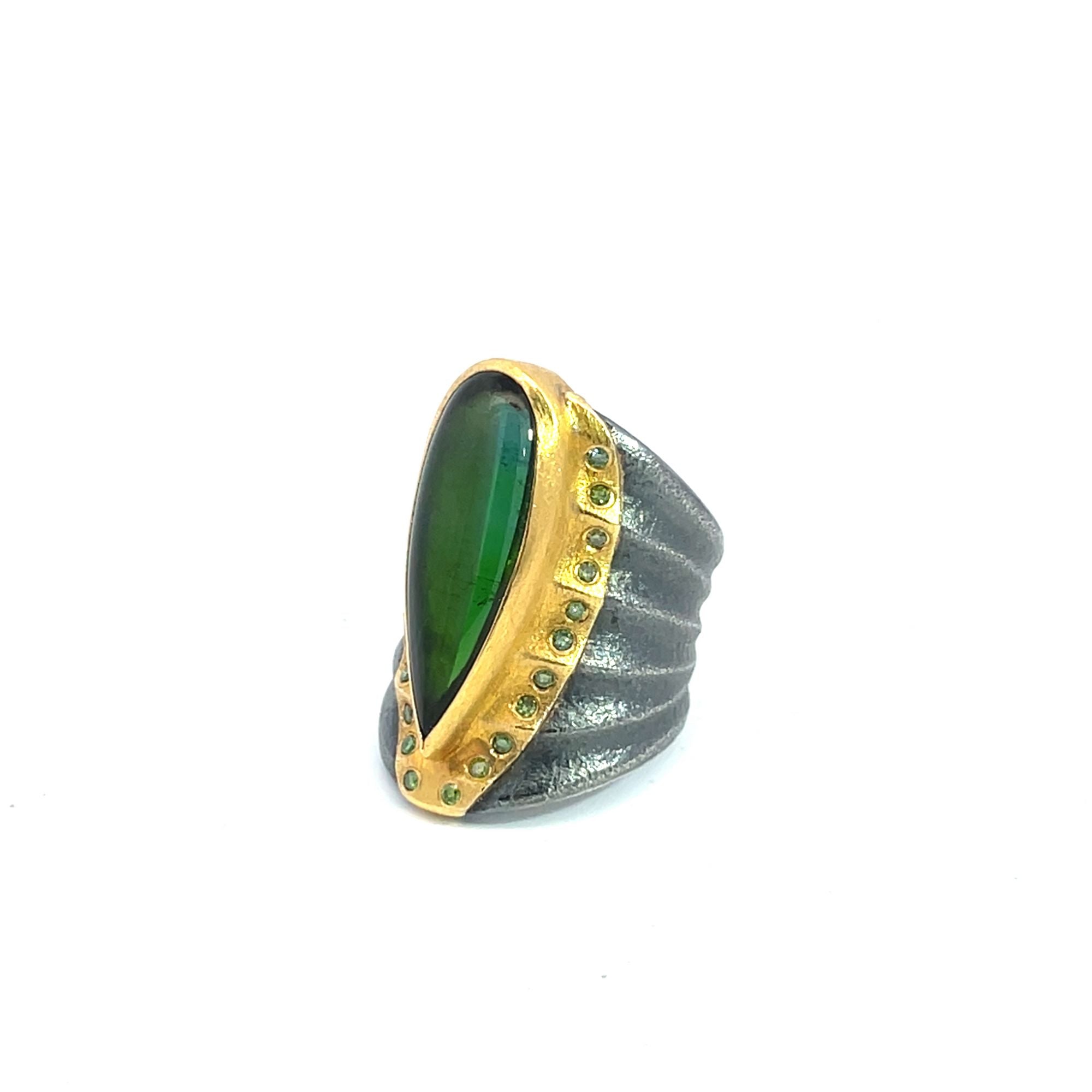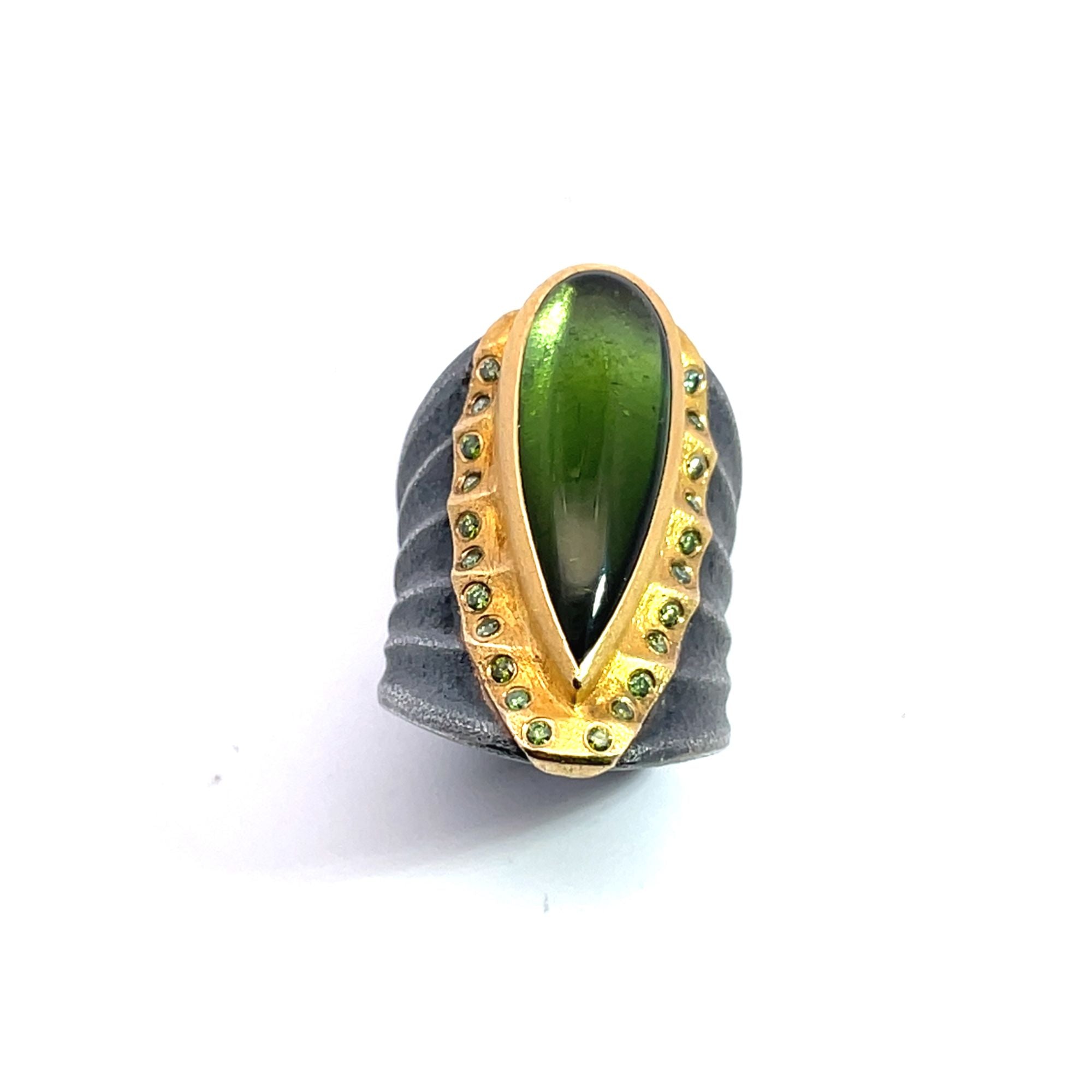 Peter Schmid for Atelier Zobel sets a 7.72 carat pear-shape cabochon green tourmaline in 22K gold with a pear-shaped ruffled gold silhouette set with 0.22 cts tw irradiated green diamonds. The ring measures 3/4" x 1-3/8" long and is size 6.75-7.