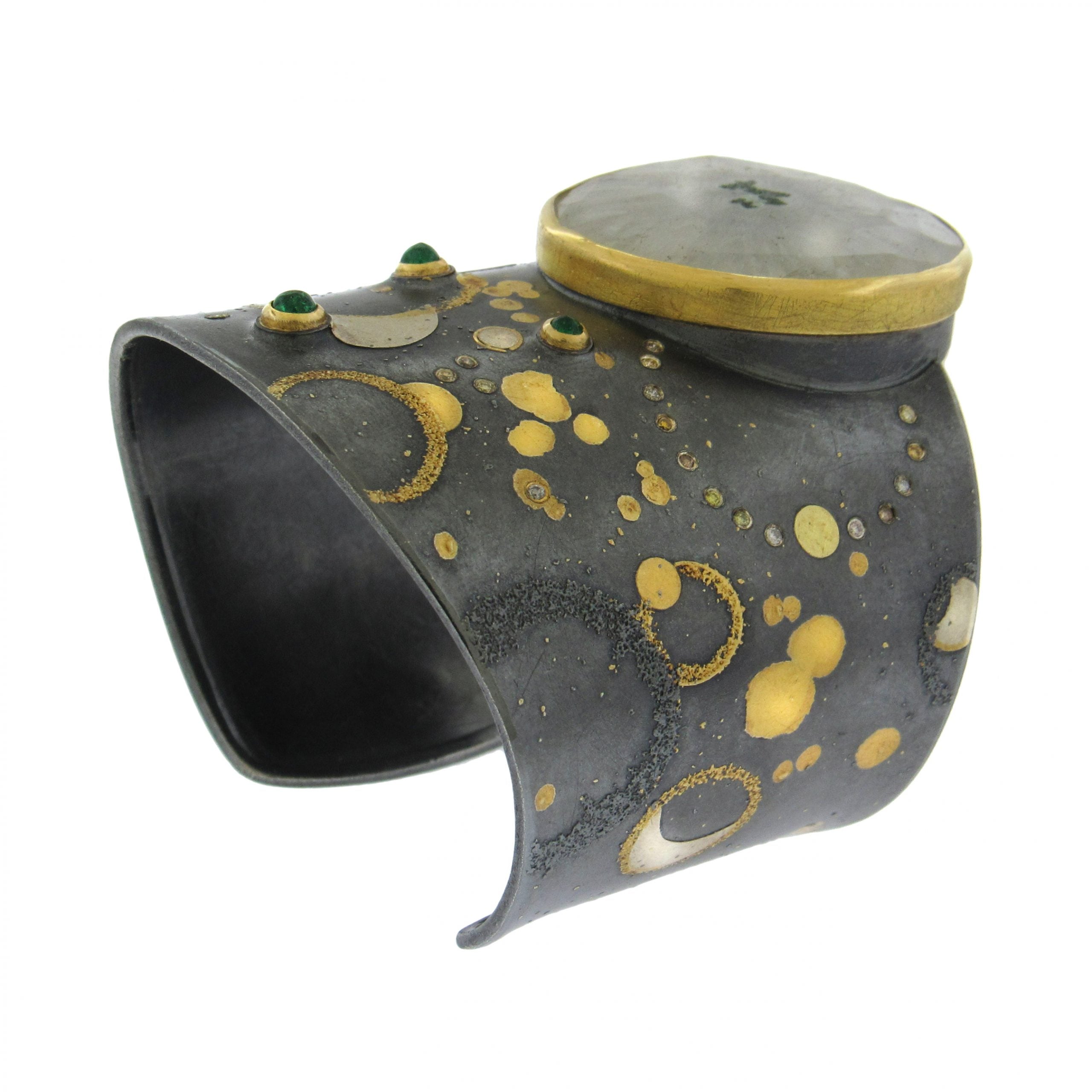 We love that Peter Schmid makes power cuff bracelets for women and this is one of our favorites to start off the year. The 69.37 carat solar quartz gemstone, cut from stalactites, brings its own earthly spirit to this dramatic oxidized sterling, 22K and 24K bracelet accented with diamonds,and 0.58 cts tw emerald cabochons. The bracelet measures 2-3/4" at the widest and fits 6-1/2" wrists.