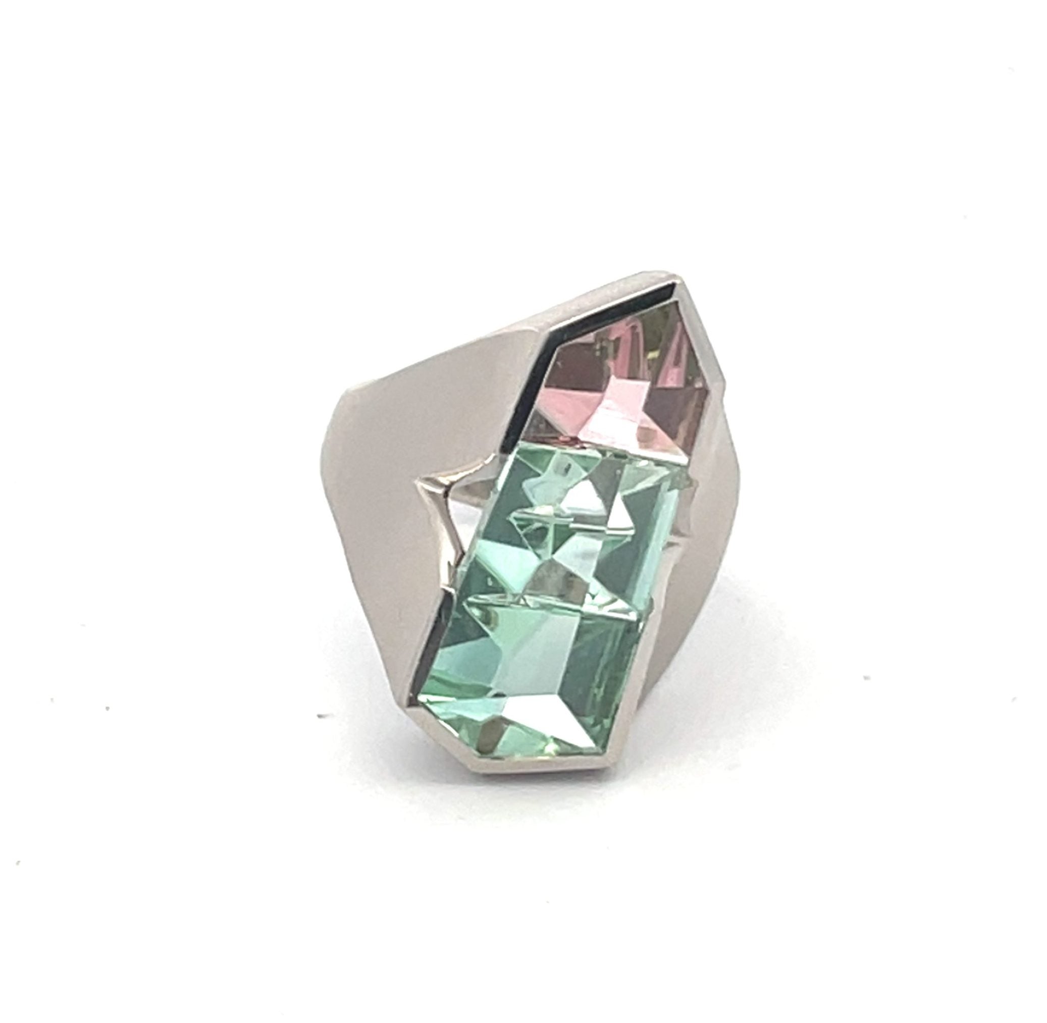 Natural bi-color tourmaline, 7.29 cts, extremely rare single stone graduating from rosy pink to pale mint green, cut by Philipp Munsteiner in an arrow shape and faceted to show all the beauty, flash and sparkle of tourmaline, unheated and iconic of Atelier Munsteiner's vision to express nature's own beauty through sculpture. The ring, in a platinum curved mounting to best complement the gem, measures 3/4" x 1" x 1/4" above the hand and is size 7.