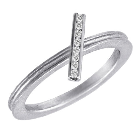 Put together your stack of platinum bands with this diamond diagonal crosspiece to hold them all together visually,0.08 cts diamonds on a grooved platinum band,by Barbara Heinrich.
