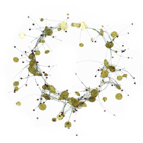 18K yellow gold and rubies make this 'Pluja' necklace by Enric Majoral as luxurious as it is playful, This three-strand version combines 18K gold matte-finished circles strung on black nylon wire in a spray-like pattern, with deep red ruby briolettes. 17" long, it rustles softly like the rain in Barcelona -- thus its name, 'Pluja', in Catalan.