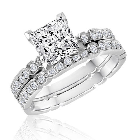 Princess-cut diamonds are sparkling yet tailored with their straight edges and square design. To emphasize its features,Simon G created a simple mounting that sets your princess-cut diamond above a diamond micropavÌÄå© engraved mounting with matching wedding band,0.44 cts diamonds in the mounting.