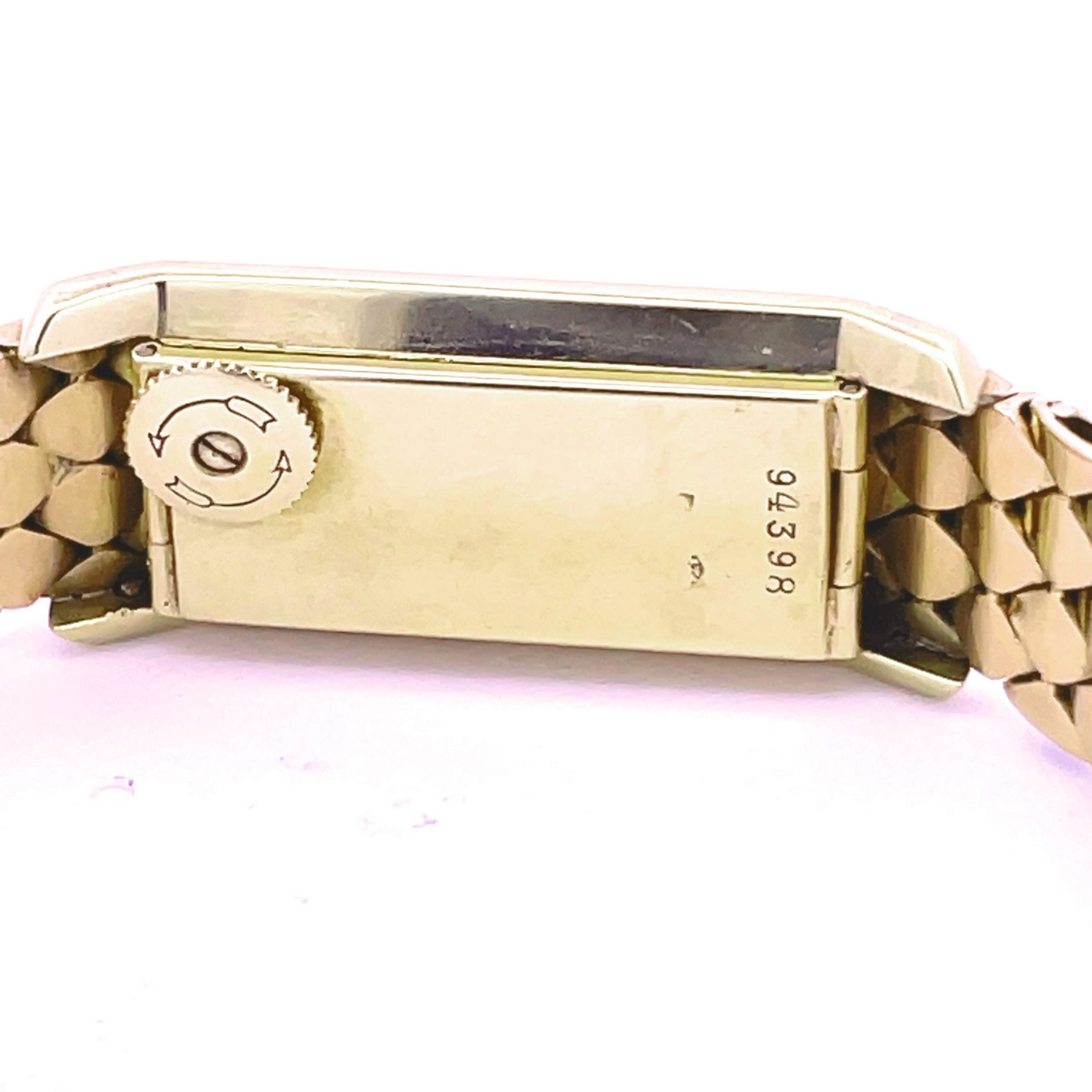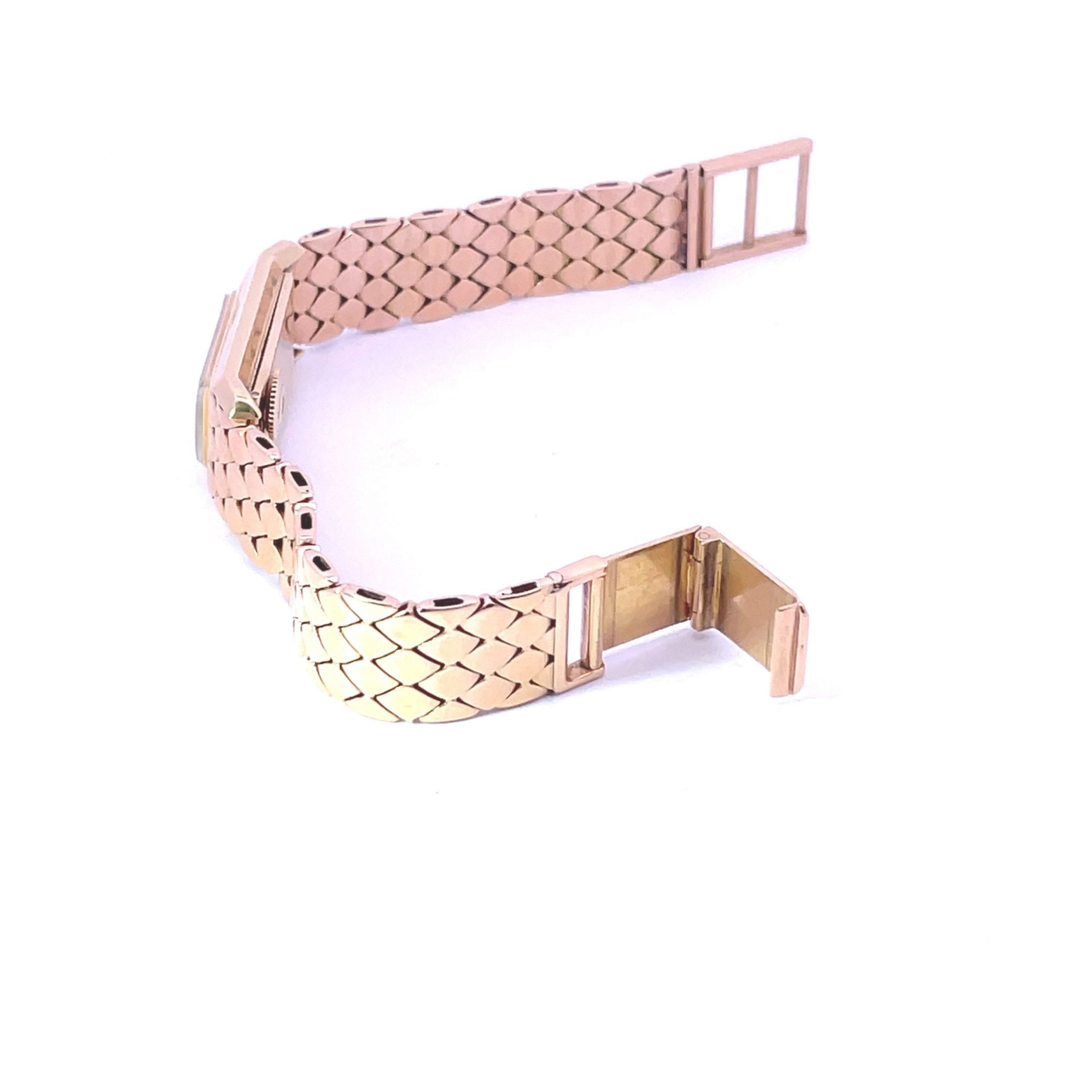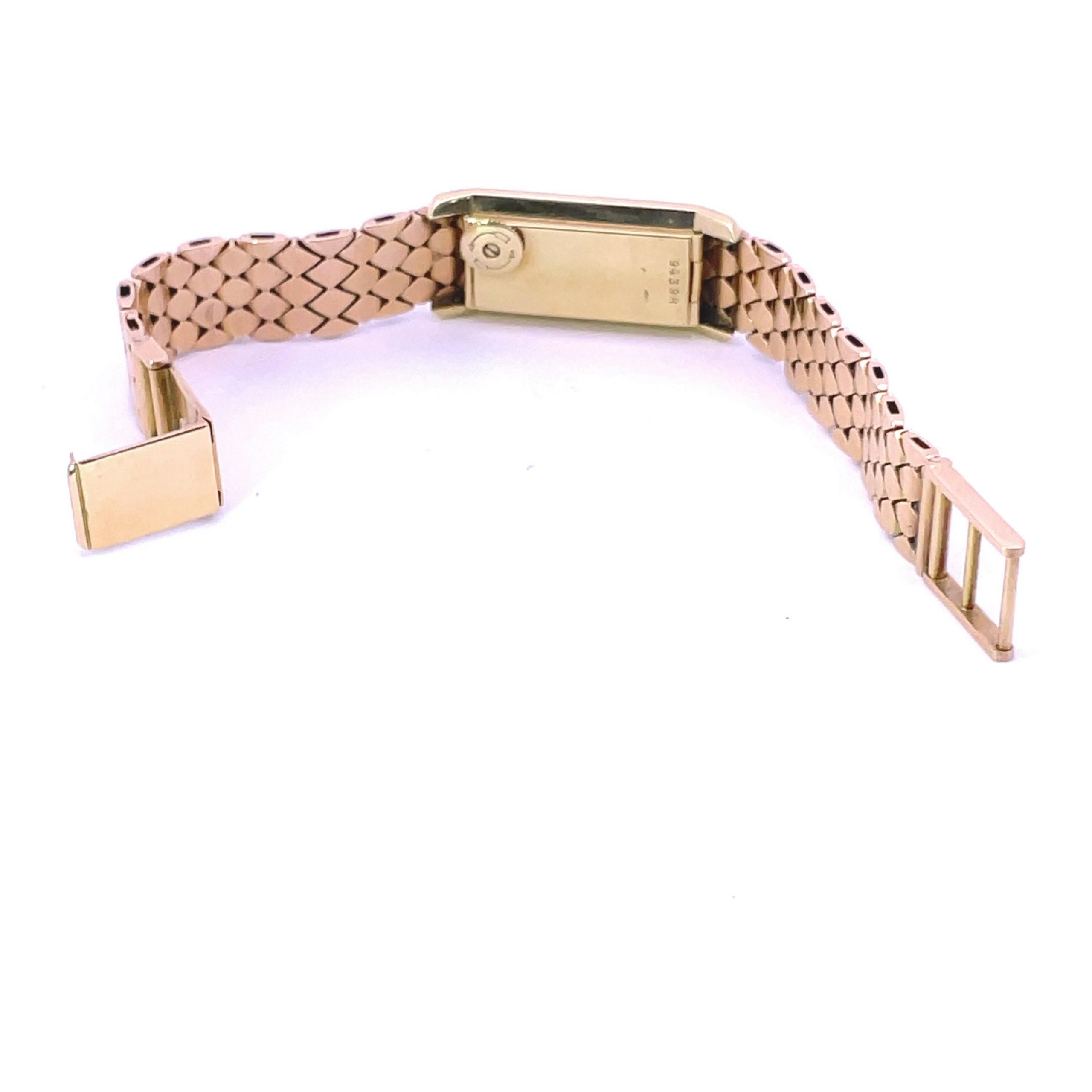 Rare 18K pink and yellow gold early Jaeger LeCoultre Duo-Plan backwind tank watch, circa 1945, with original 18K gold bracelet, measures 16mm" x 34, with original dial, gilt dart hour markers and painted 6 and 12, manual backwind movement warrantied by Aaron Faber for 2 years. The diamond pattern link bracelet is 6-1/2".