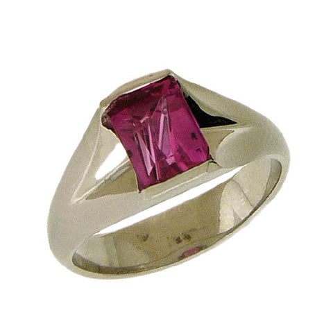 An intensely pink raspberry tourmaline from Tom Munsteiner shows his signature criss-cross back facets combined with his Prism facets at top,in a classic rectangular shape,1.05 cts,in Jutta Munsteiner's V-form platinum mounting,matte and polished,to highlight the gem from side and top. Measures 1/4" in diameter.