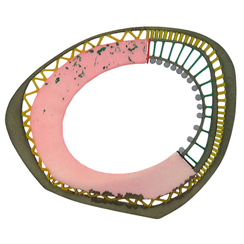 Rebekah Laskin's color palette is at once intriguing and mysterious, explored here in one of her 3-D printed bracelets, two sides painted by the artist, in pink, gold and charcoal, the flip side in more muted shades of gray-green, pink and mauve.