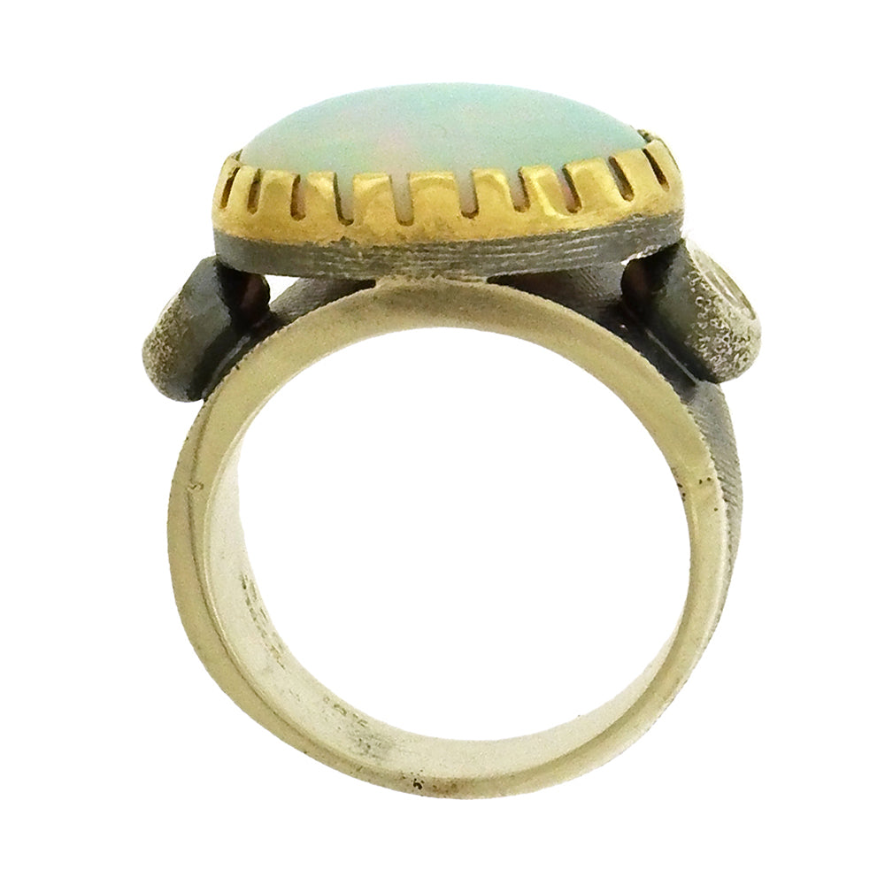 Oval cabochon opal flashing blue, green and red is set by designer Rene Escobar in 18K gold, with accent diamonds and an oxidized sterling silver tapered band. Measures 3/4" x 1/2".