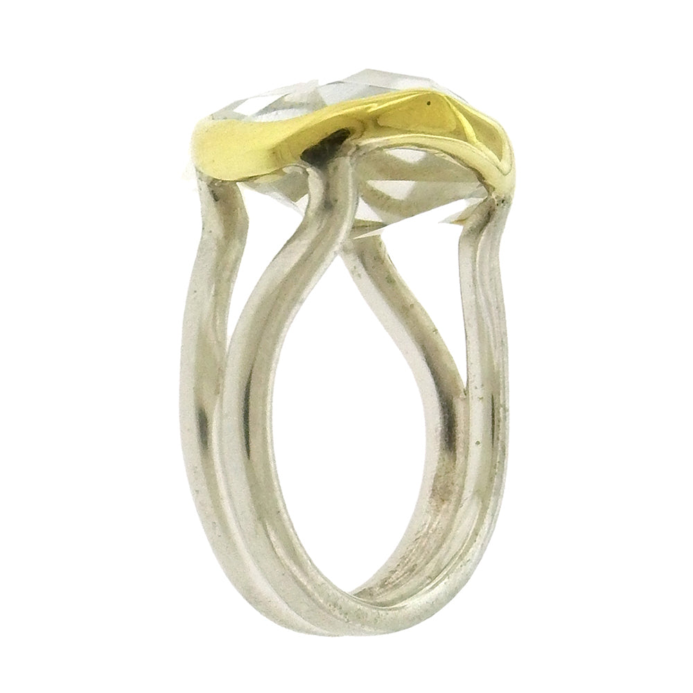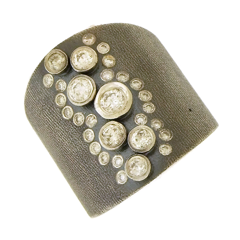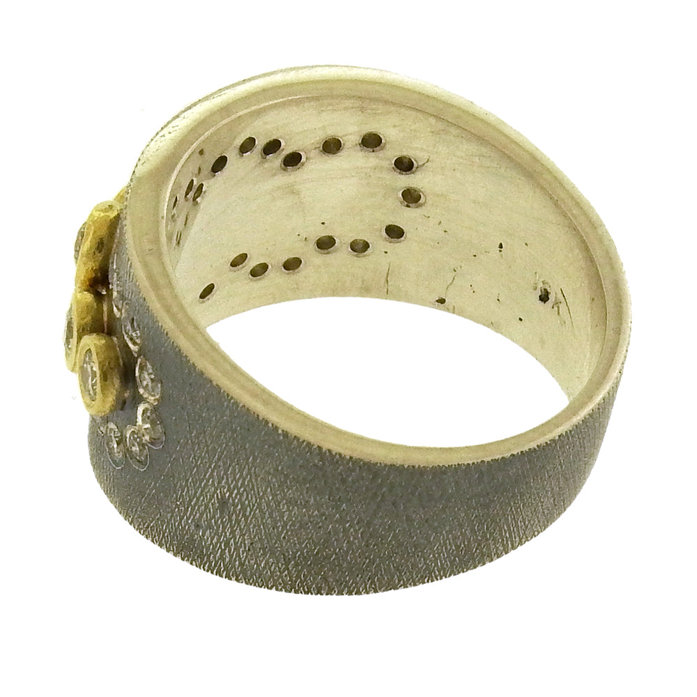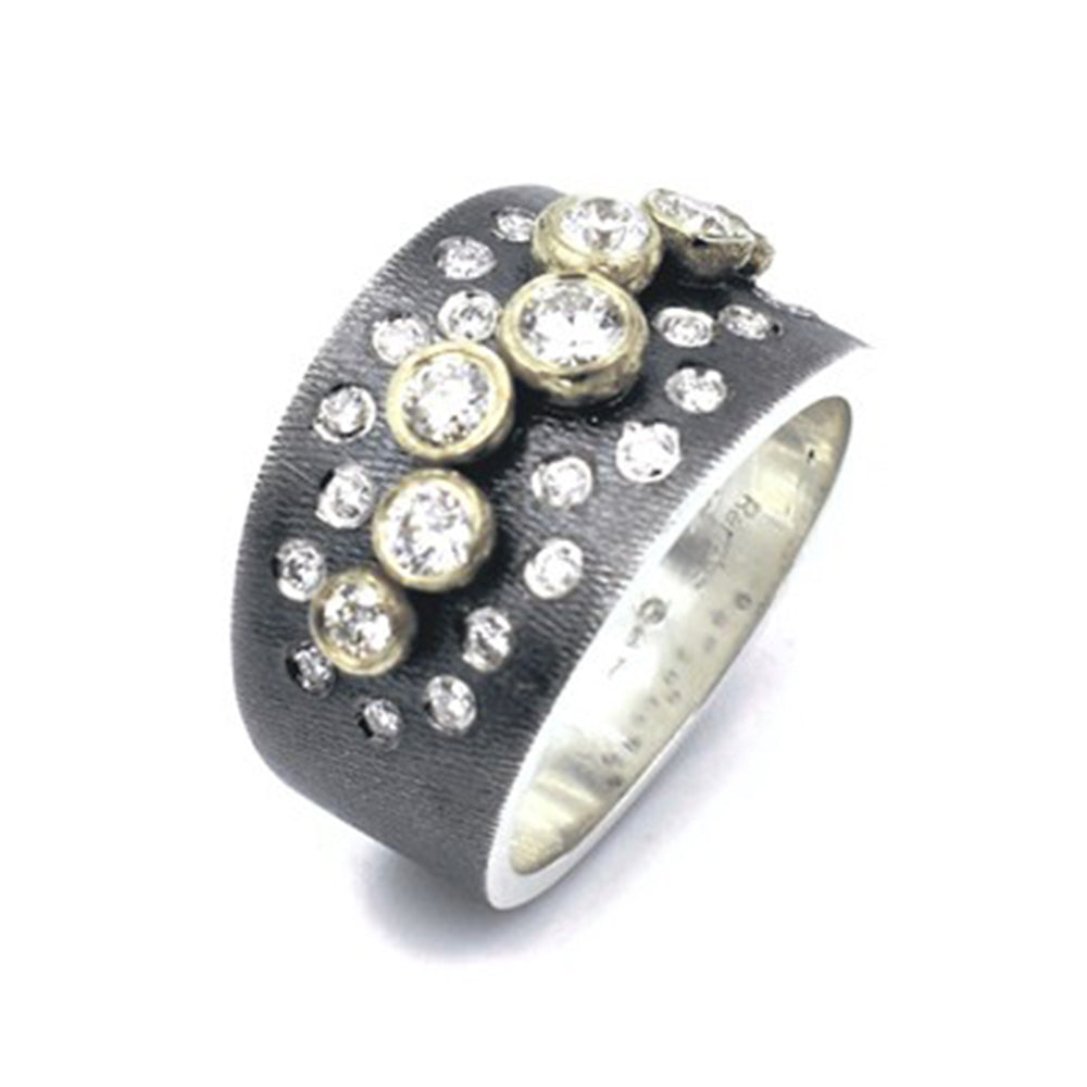 Rene Escobar sets precious diamonds in his oxidized sterling and 18K gold band, the 'Victoria', set with diamonds in gold bezels and directly in the sterling silver. The ring measures 3/4" x 1/2".