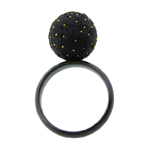 Arata Fuchi's mysterious and compelling sculptural designs are each made by hand,fabricated in sterling silver and silver powder,with pinpoints of pure gold._x000D__x000D_Here,a bead of oxidized silver set with pinpoints of 24K gold,on an oxidized stelring band. 1/2" diameter.