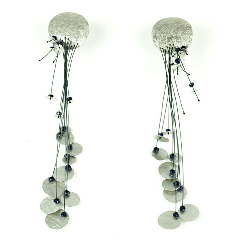 18K white gold long 'Pluja' earrings, by Enric Majoral, have a convex curved 18K white gold oval top, with a cascade of sapphire briolettes and graduated white gold circles to create the dramatic, playful, whispering rustle of these 'Rain' earrings -- 'Pluja' means rain in Majoral's native Catalan language. 3-7/8" long.
