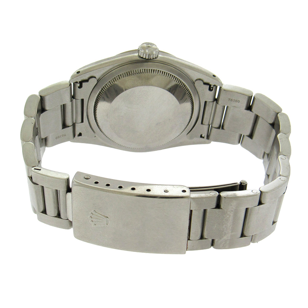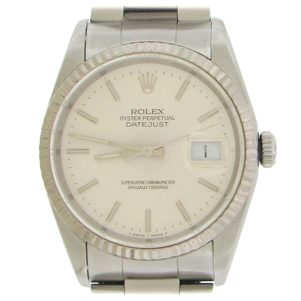 Stainless steel Rolex Ref. 16234 Datejust circa 1992, is a 36mm automatic center seconds water-resistant chronometer wristwatch with date and a stainless steel Rolex Oyster bracelet with deployant clasp. The case has a screwed-down case back and crown, engine-turned 18K white gold bezel, silver dial with applied white gold baton hour indexes, outer minute/seconds track, aperture for the date, and white gold baton hands. The caliber 3135 movement is rhodium-plated, 31 jewels, with hack mechanism, warrantied by Aaron Faber for 2 years, is provided with an extra crystal.