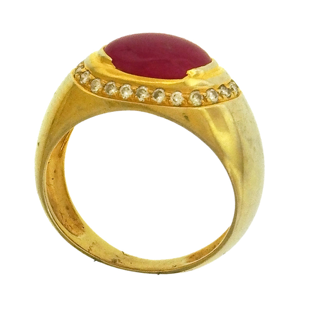Oval ruby cabochon, approx. 2 carats, set in a classic diamond-framed domed mounting, size 7.