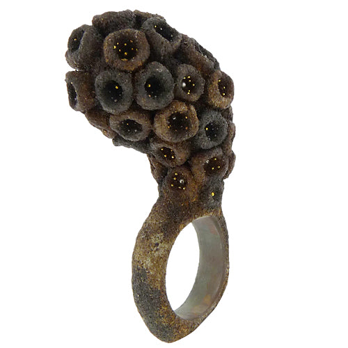 Arata Fuchi's silver ring sculpture is a mysterious and compelling form,the curved structure rising 1-1/2" above the ring itself,curving as though weighed down by the individual pods on the surface,patinated a reddish-brown,from which bright granules of 24K gold gleam. 1" across at the widest,2-1/4" overall top to bottom.