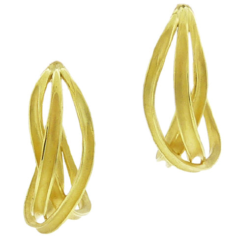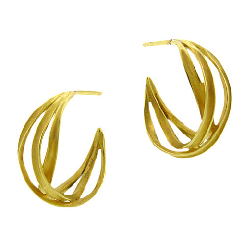 Barbara Heinrich's Seafoam series is graceful and intriguing, its curved ribbons of 18K gold interwoven to create a dynamic play of positive and negative space, the burnished gold strands catching the light. Here, the small Seafoam hoop earrings, measuring 3/4" in diameter, for pierced ears.