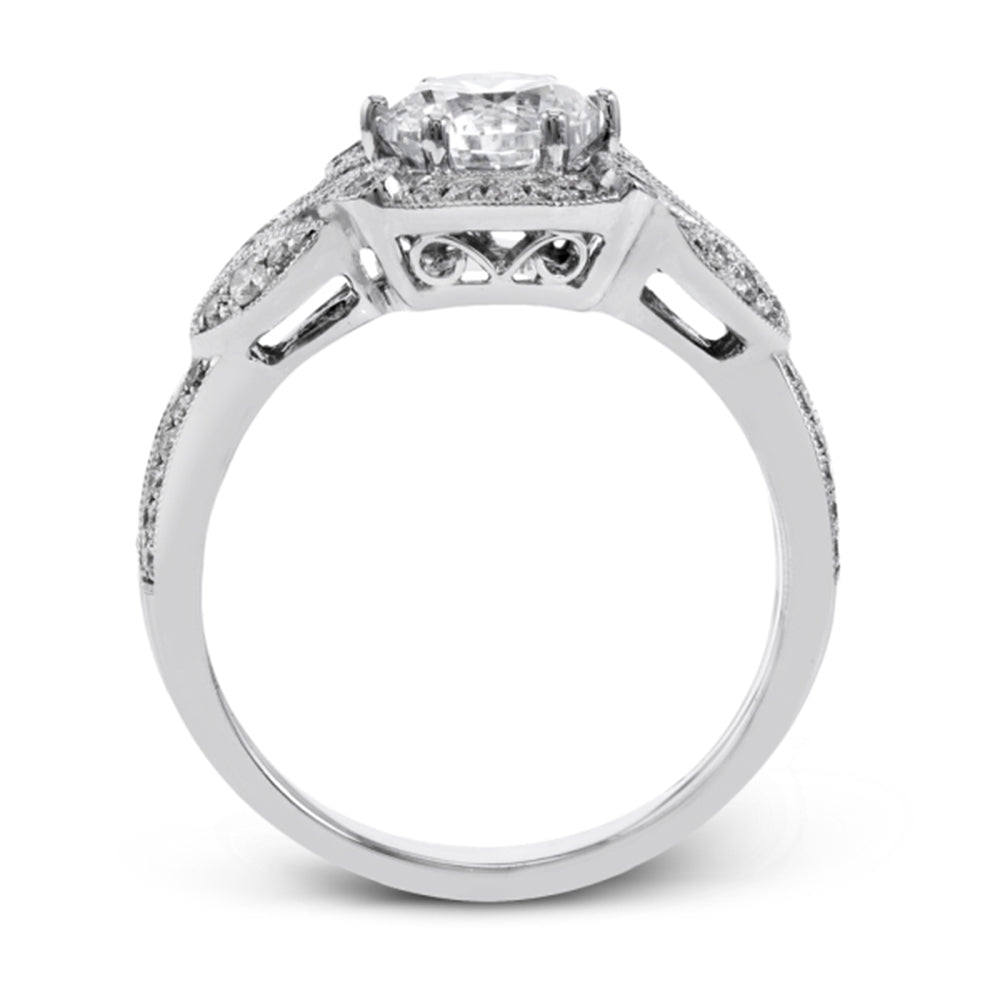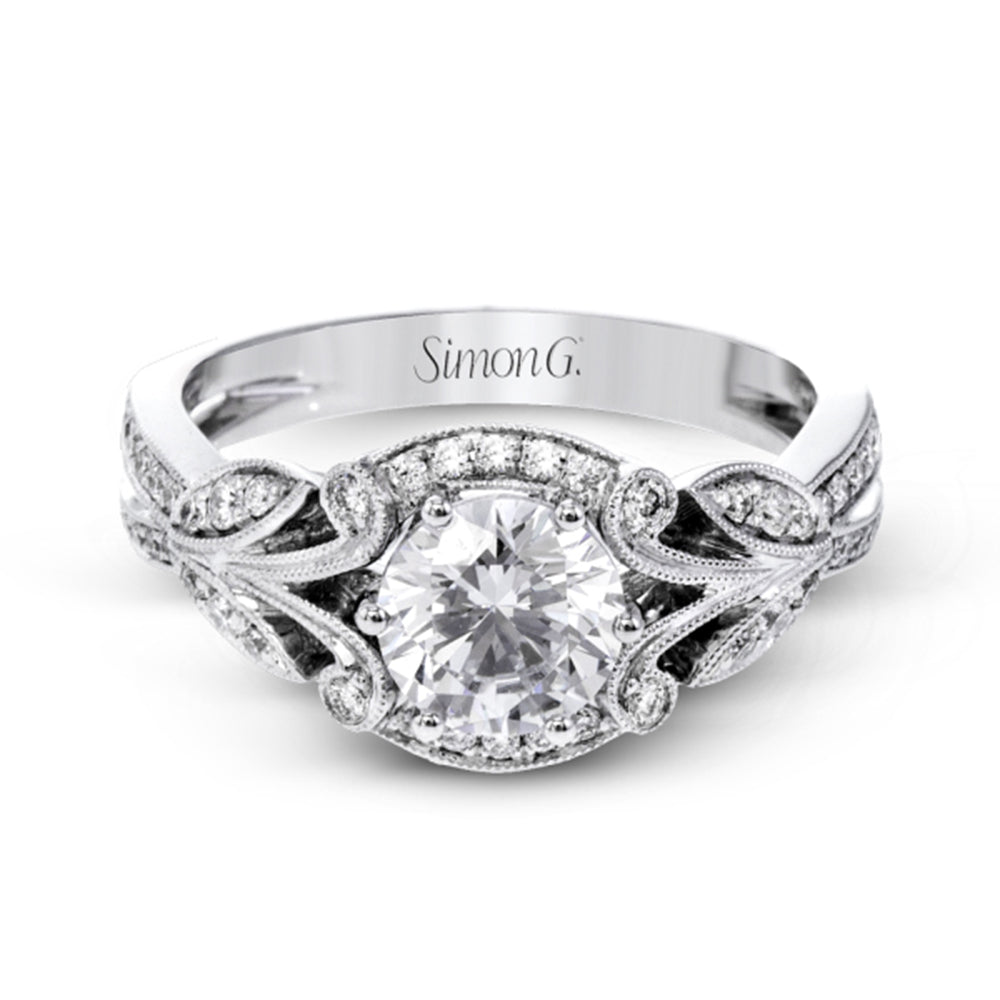 From Simon G's Garden collection, this floral-inspired vintage style engagement ring mounting is beautifully detailed with 0.28 carats diamond micropavé, for a 1.25 carat center gem.