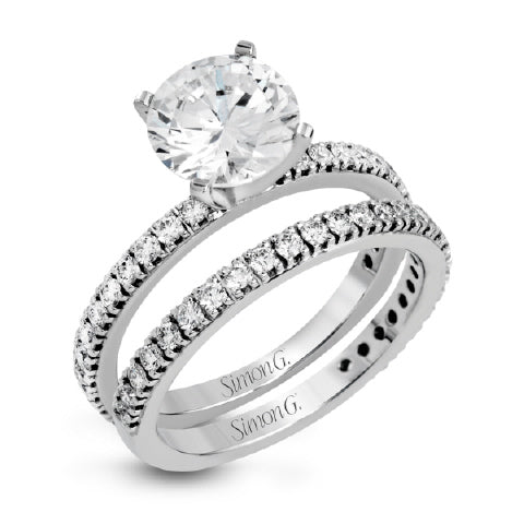 Simon G's 18K diamond wedding set is shown here with the solitaire semi-mounting and half-eternity band accented with 0.44 ct micropavÌÄå© diamonds. All Simon G bridal jewels are also available in platinum or yellow gold.