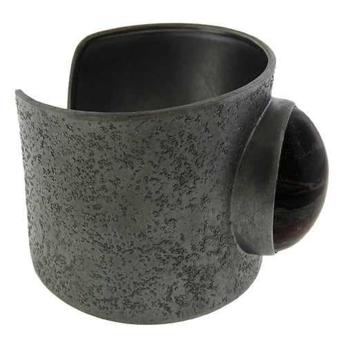 Simon Spinoly's oxidized sterling cuff is set at center with a striated cabochon hematite in shades of gray,black and oxblood red,110.40 cts,the textured cuff picking up sparks of light as the wearer moves. Cuff measures 2" wide,fits medium wrist.